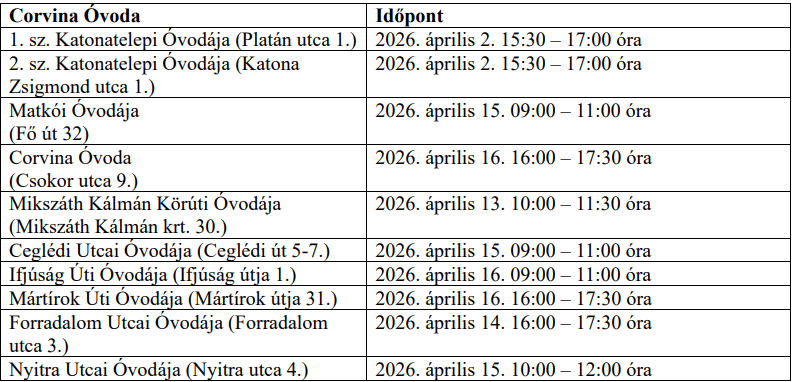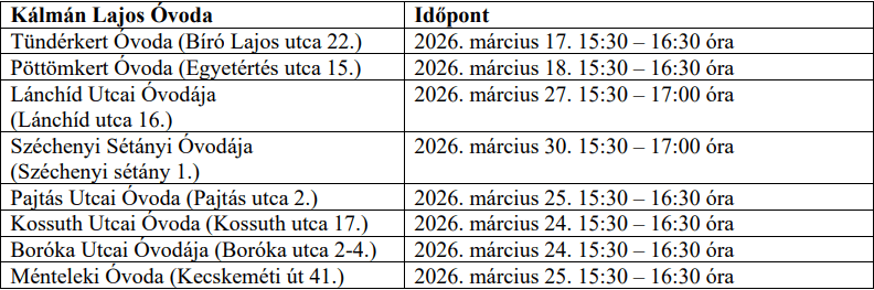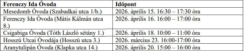 A nyílt napok részletes időpontjai és helyszínei a város honlapján is elérhetők: https://kecskemet.hu/varosunk/oktatas-neveles/ovodai-beiratkozas