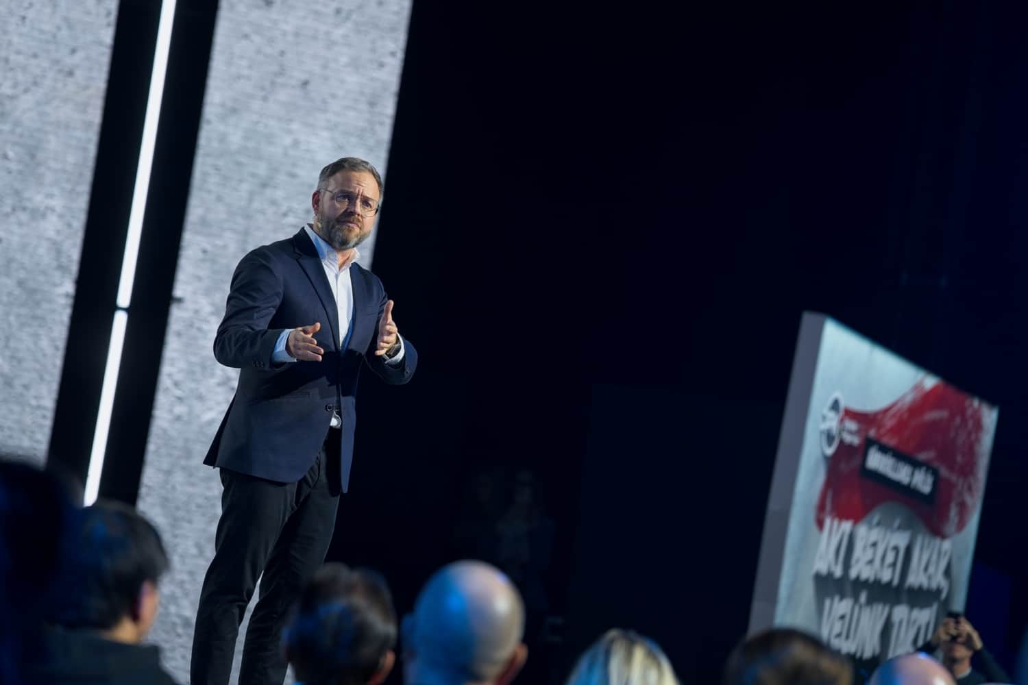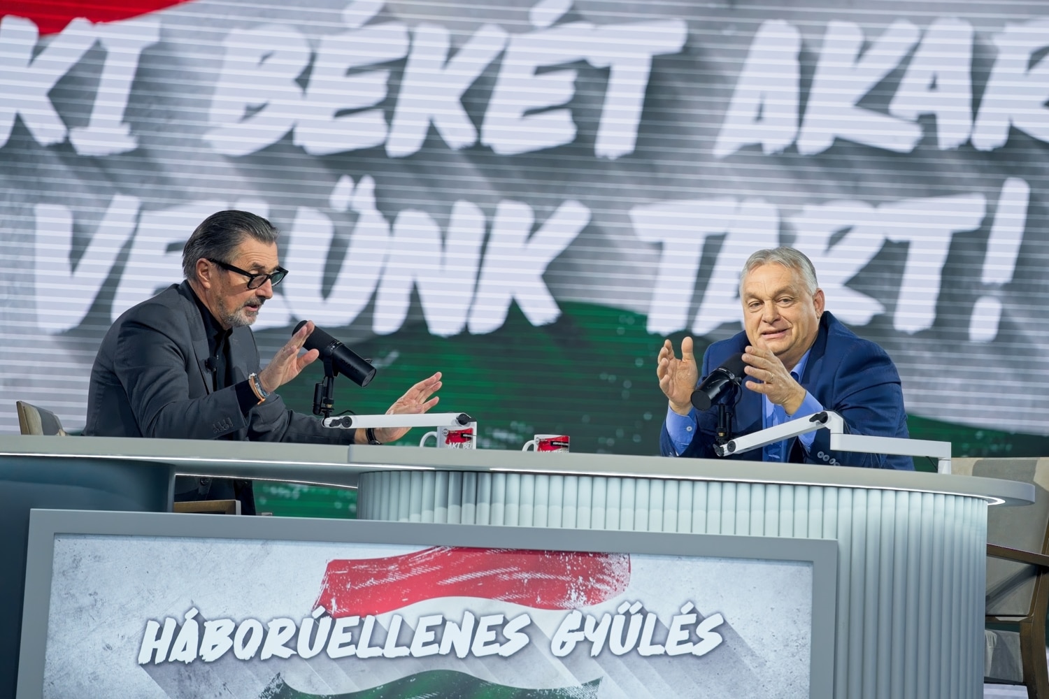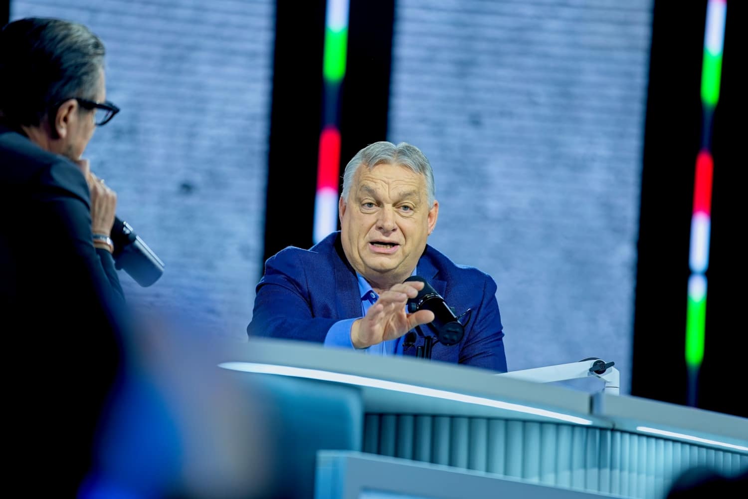 A rövid beszélgetések után a nézőtéren keresztül érkezett a színpadra Orbán Viktor miniszterelnök, akivel közel egy órás beszélgetést folytatott Csiszár Jenő műsorvezető, diplomata.