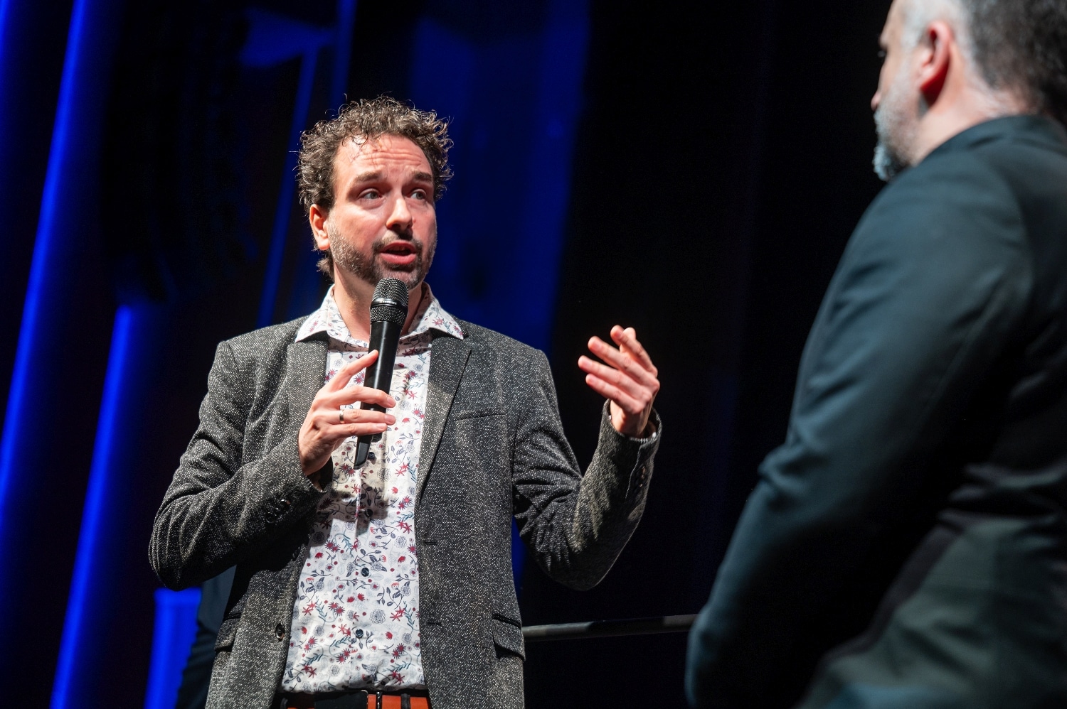 S mivel az est folytatásához a színpad átrendezésére volt szükség – az ütőhangszerek egy részét kivinni, más részüket meg áthelyezni kellett –, a kecskeméti szimfonikusok művészeti vezetője, Hollókői Huba magához ragadta a mikrofont, s miután maga mellé hívta a nézőtéren helyet foglaló fiatal zeneszerzőt, rövid beszélgetést kezdeményezett vele. Kérdéseire Magda Dávid őszinte, életvidám, humort sem nélkülöző válaszokat adott. A nagyérdemű megtudhatta, hogy közvetlenül darabjának ősbemutatója után hogyan érzi magát – „Ha egy szóval kellene összegeznem, akkor azt kell mondanom, hogy fantasztikusan, valóban emelkedetten!” –, valamint azt is, hogy a mű megszólaltatásához szükséges összes hangszert a zenekar nem tudta saját erőből biztosítani, ezek egy részét a Kodály Iskolából kapták, de Palotás Gábor és kollégái kölcsönhangszerei is szerephez jutottak, sőt, a szólista az anyósának a gongját, valamint a növendéke labdáját is használta –„Hangszercsoportokra osztottuk a tételeket, és mivel a harmadikban a bőrök szólaltak meg, innen jött az ötlet még a komponálás kezdetén, hogy a bőrökhöz valami extremitást is szeretnék beemelni, így jött a labda a timpanival”. Kiderült az is, hogy a darab megírása mennyi ideig tartott: „A komponálás ott indul, amikor az ember elkezd gondolkozni a mű formáján, lelkén, hangulatain stb., és azután elkezdi írni azt, és amikor késznek gondolja, akkor még letisztázza. Ezután még a számítógépes programmal is meg kell harcolni, ami kemény, időigényes munka. Maga az alkotás folyamata körülbelül két hónapig tartott, ezalatt kisebb kórusművekkel, kamaradarabokkal is foglalkoztam, de időm nagy részét ekkor ennek a versenyműnek a szerzése tette ki.” A spontán beszélgetés osztatlan sikert aratott a jelenlévők körében, az elhangzottak még emlékezetesebbé tették a mű egyébként is „zajos” elismerést kiváltó fogadtatását.