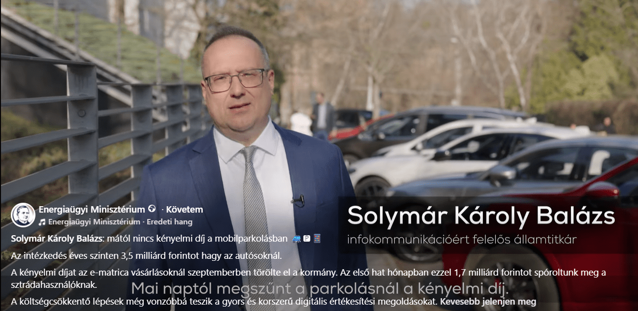 Jó hír a magyar autósoknak: március 16-tól nincs kényelmi díj a mobilparkolásban – jelentette be az online közösségi oldalon videós bejegyzésében Solymár Károly Balázs. Az Energiaügyi Minisztérium infokommunikációért felelős államtitkára szerint az intézkedésnek köszönhetően évente összesen 3,5 milliárd forint marad az autósoknál.