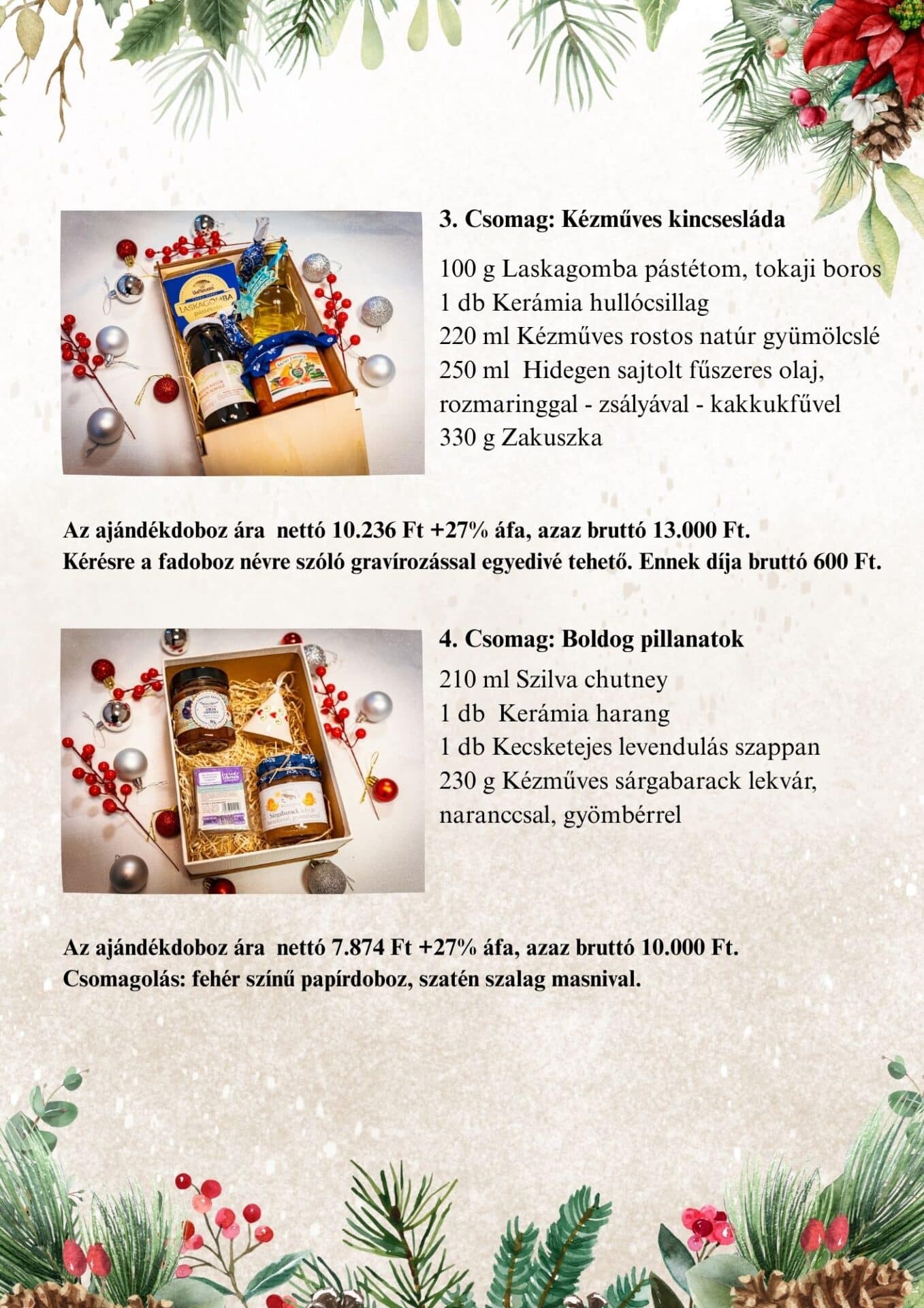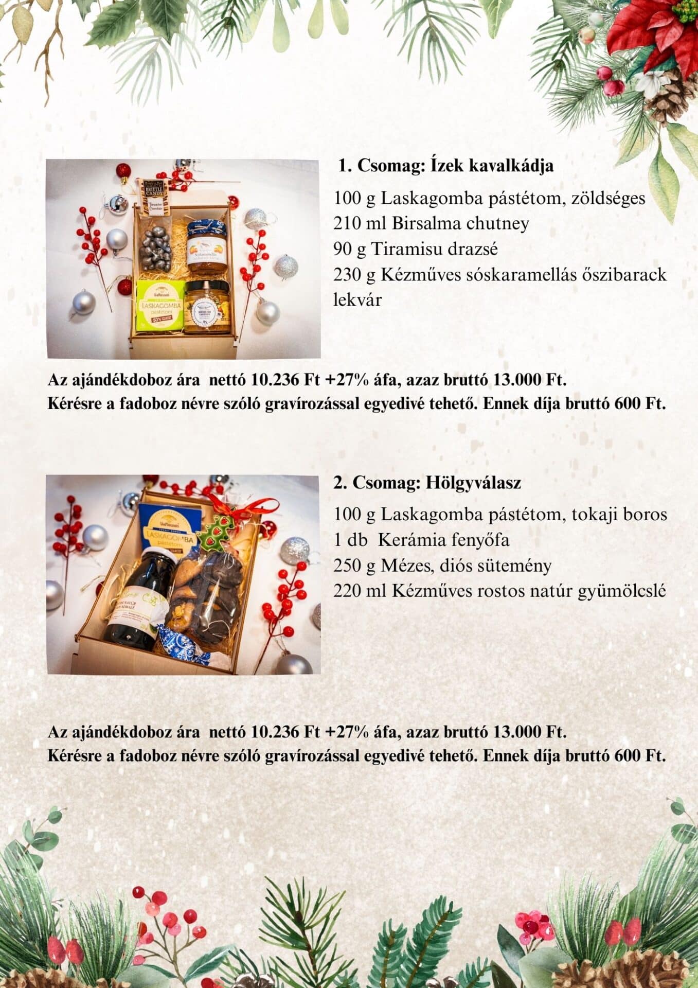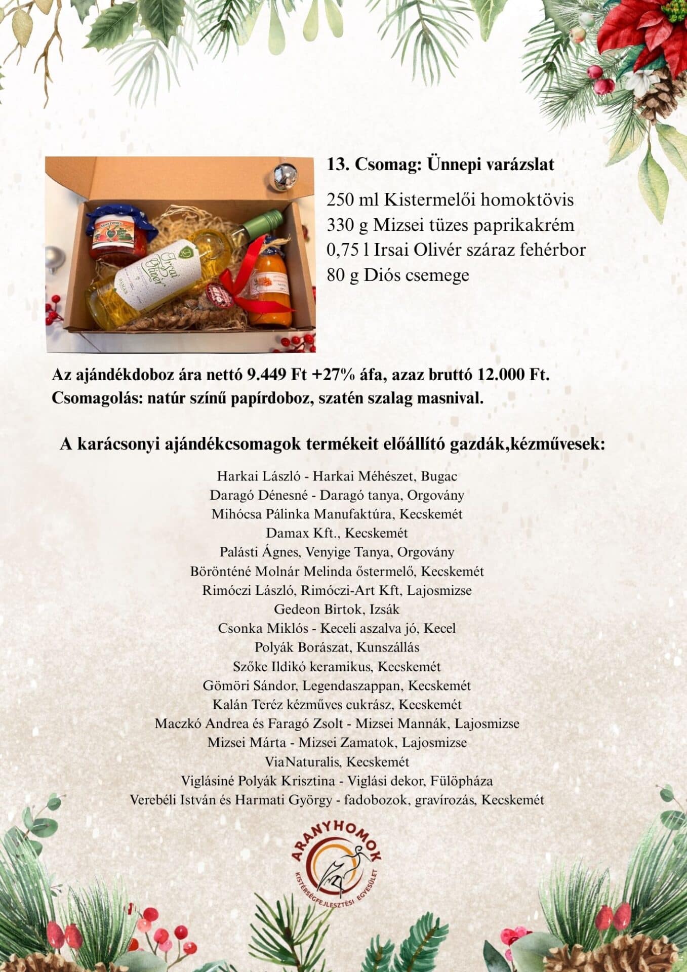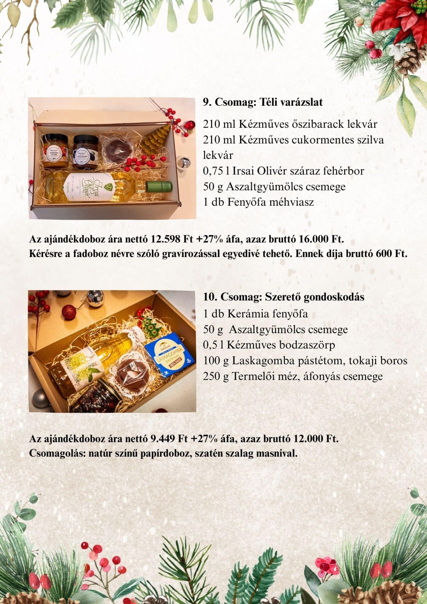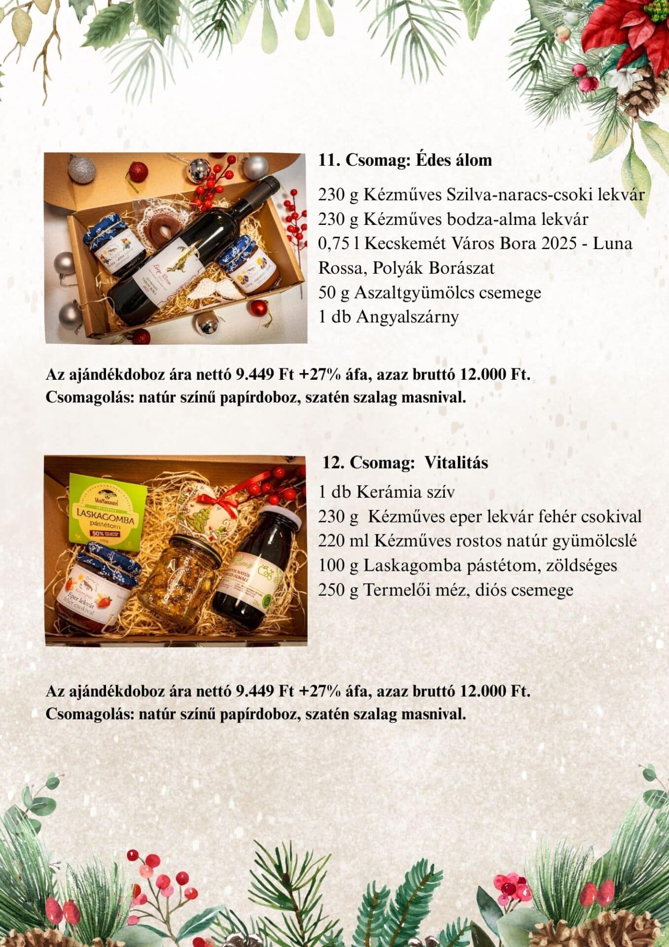A csomagokban továbbra is a minőséget és egyediséget helyezzük előtérbe, Kecskemét és környéke kézműves kincseivel, helyi kistermelői termékeivel, valamint finomságaival töltjük meg dobozainkat. Változatos ajánlatunk lehetővé teszi, hogy figyelembe vegyék annak ízlését, akinek az ajándékot szánják. Az egyedi összeállítások tökéletes választásnak bizonyulnak, hogy meglepje szeretteit az ünnepekre, akár névre szóló gravírozással is. Támogassa Ön is Kecskemét és térsége kistermelőit, kézműveseit azzal, hogy tőlük vásárol karácsonyi ajándékot munkatársainak, üzletfeleinek, szeretteinek! „Tegye a karácsonyi ünnepeket különlegessé a térségi ajándékokkal!” A rendeléseket folyamatosan, de legkésőbb 2025. december 8-án, hétfőn 12 óráig várjuk e-mailben a [email protected] címen, a megrendelése előre utalással érvényes. Felmerülő kérdéseik esetén Faluvégi Enikőt kereshetik a +36-30/454-9627-es telefonszámon. A csomagokat Kecskeméten, a Csányi János körút 14. szám alatt lehet átvenni legkésőbb 2025. december 16-áig, elkészültükről értesítést küldünk.