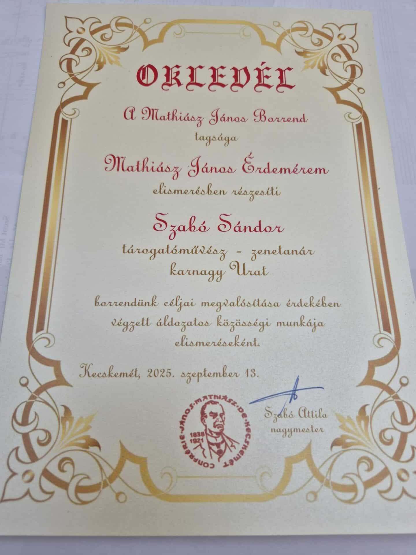 A háromnapos programsorozat részeként szombaton borlovagokat is avattak. Az ünnepi ceremónia végén az ismert kecskeméti pedagógus, karnagy és előadóművész értékes elismerést vehetett át: a Mathiász János Borrend tagsága a szervezet céljai megvalósítása érdekében végzett áldozatos közösségi munkájáért Mathiász János Érdeméremmel jutalmazta.