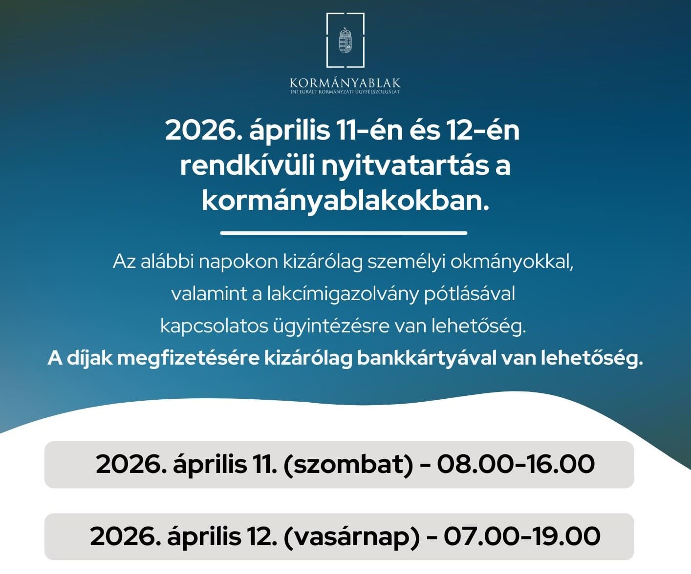Ezeken a napokon kizárólag személyi okmányokkal kapcsolatos ügyintézésre és a lakcímkártya pótlására lesz lehetőség. Fontos, hogy a felmerülő igazgatási szolgáltatási díjakat kizárólag bankkártyával lehet megfizetni.