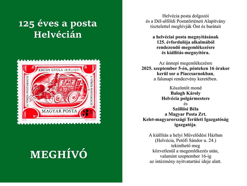Helvécián a helyi postai szolgáltatás megkezdésének 125. évfordulója alkalmából jubileumi ünnepséget, valamint posta- és bélyegtörténeti kiállítást rendeznek a posta dolgozói és a Dél-alföldi Postatörténeti Alapítvány, az önkormányzat támogatásával, 2025. szeptember 5-én, pénteken.