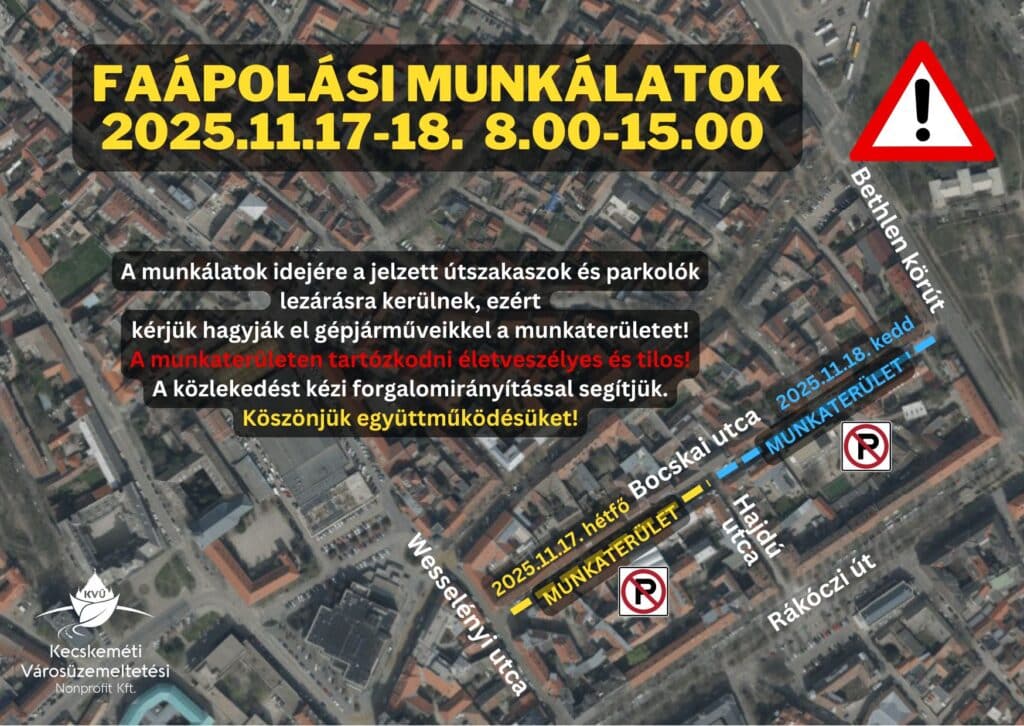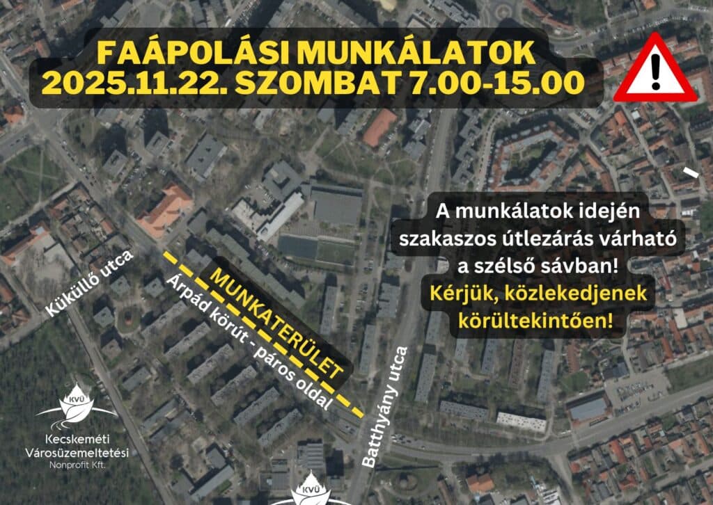 Faápolási munkák miatt 2025. november 17-én hétfőn 6.00-16.00 óra között „megállni tilos” lesz érvényben a Bagi László utca 1-7. és a Batthyány utca 19-23. társasházak által határolt parkolóban, amelynek betartását a Kecskeméti Városrendészet ellenőrzi.