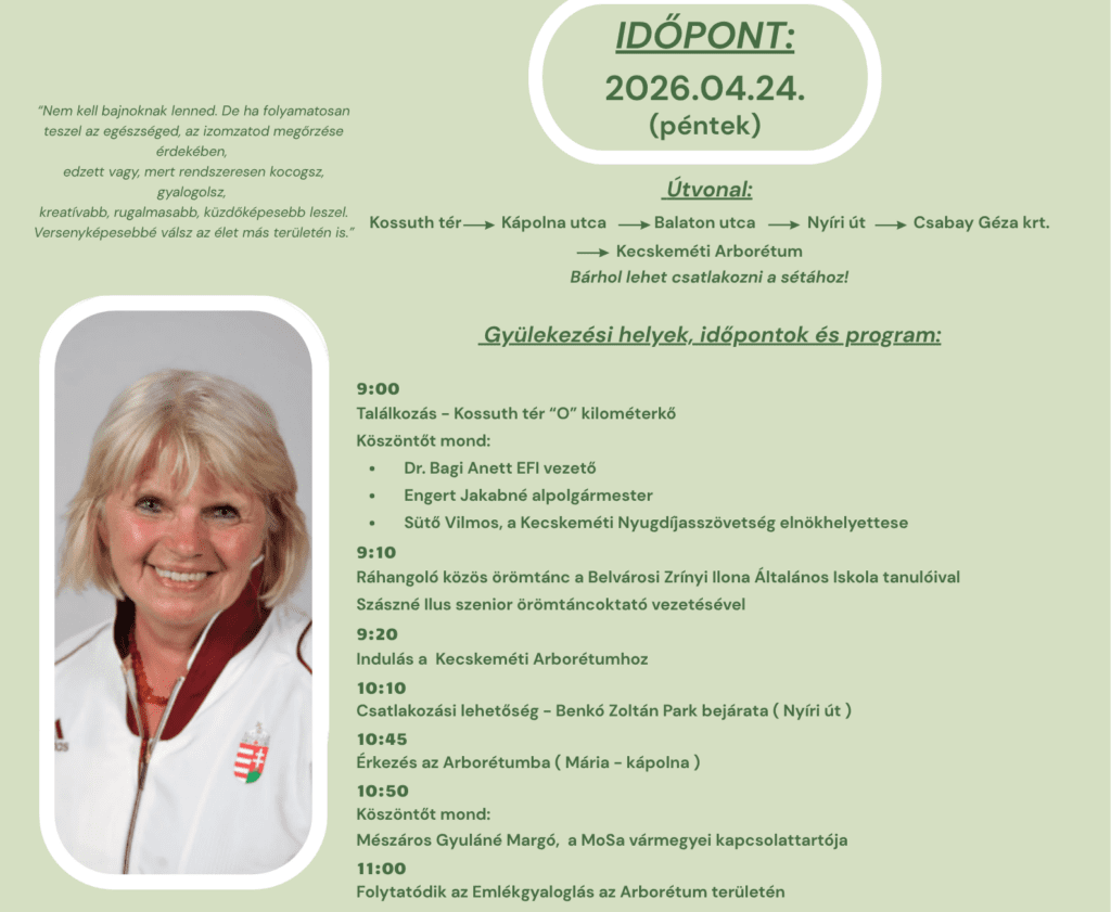 A Kecskeméti Egészségfejlesztési Iroda idén második alkalommal rendezi meg a Monspart Sarolta Emlékgyaloglást Kecskeméten együttműködésben a Kecskeméti Nyugdíjasszövetséggel és a Cédrusnet Kecskeméti Gyaloglóklubbal.