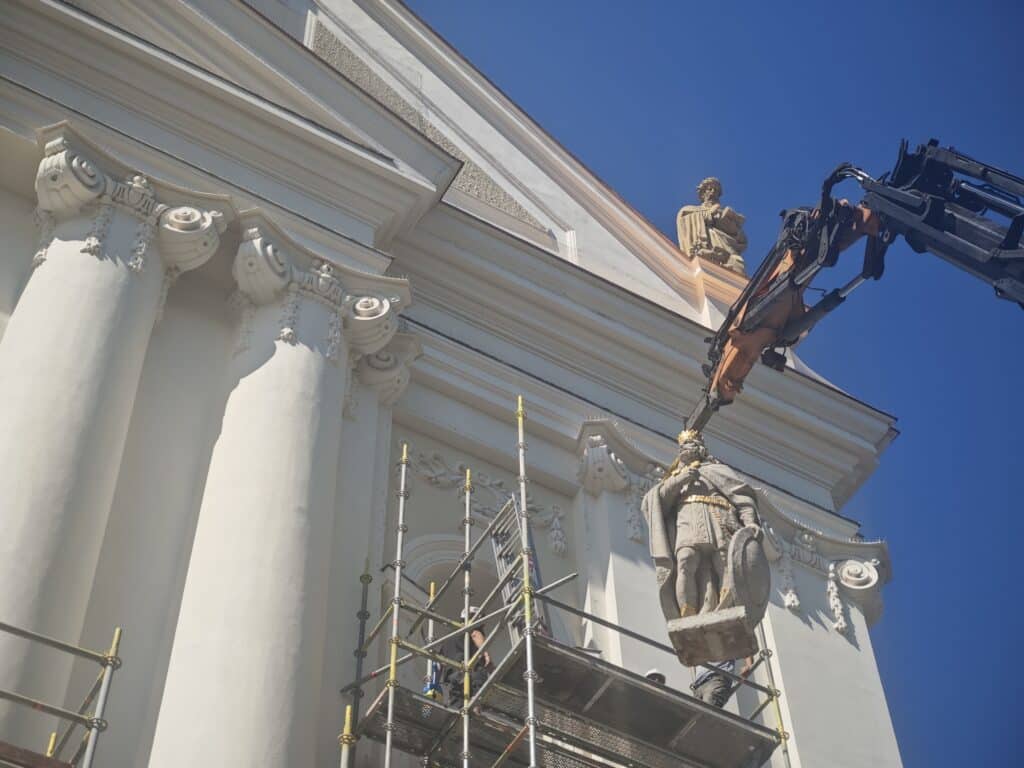 A hét éve tartó felújítások következő állomásaként ma (kedd) délelőtt újabb restaurált szobrokat helyeztek vissza a Nagytemplom homlokzatára. Előbb Szent László király 1700 kilogrammos szobra, majd Szent István királyé került a helyére, 12 méter magasan lévő fülkéjükbe.