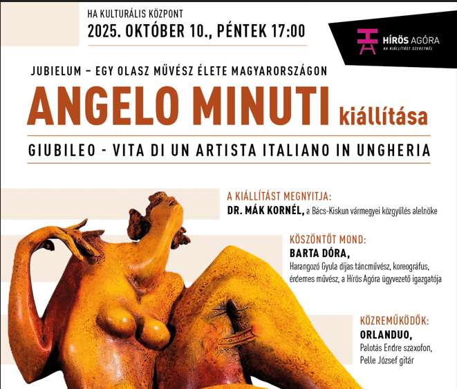 Október 10-én, pénteken nyílik Angelo Minuti olasz származású, Hetényegyházán élő szobrászművész jubileumi kiállítása a Hírös Agóra nagytermében, mely 25 év alkotásait foglalja egybe. A világhírű szobrászművész terrakotta szobrai mellett egyedi technikával készült fotói is szerepelnek a tárlaton, melyet dr. Mák Kornél, a Bács-Kiskun vármegyei közgyűlés alelnöke nyit meg. Köszöntőt mond Barta Dóra, a Hírös Agóra ügyvezető-igazgatója.