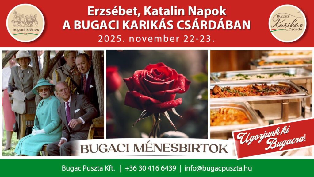 November második felében ünneplik névnapjukat két ősi név viselői az Erzsébetek és Katalinok. Rájuk gondolva, de nem csak számukra szervez november 22-én és 23-án Erzsébet-Katalin napi svédasztalos ebédet ingyenes csikósbemutatóval a Bugaci Karikás Csárda és Ménesbirtokon.