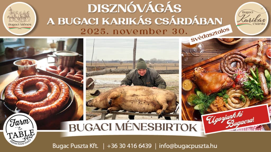 Köszöntse az idei telet, egy ősi magyar népszokással a disznótorral Bugacon a Karikás Csárdában. Hozza el a család fiatalabb és idősebb tagjait is, és nosztalgiázzanak közösen egy frissen sült pecsenye, orjaleves, töltött káposzta, hurka, kolbász, friss mangalica sült, párolt káposzta és hájas sütemény mellett.