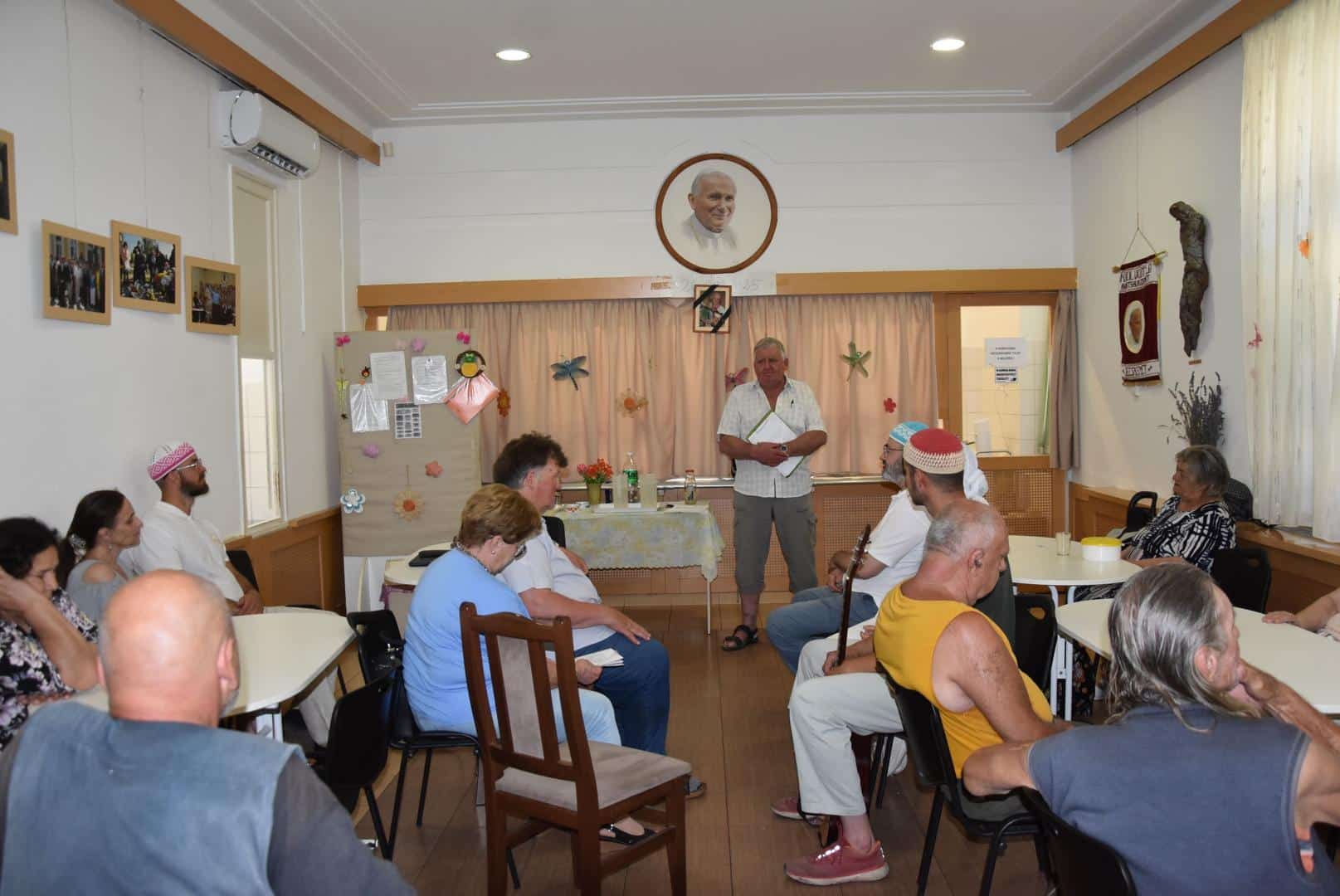 A pénteki ebédosztást megelőzően Szénási Pál és Anna leánya közreműködésével felcsendült a Himnusz, melynek hangjai után Farkas Pál, a Wojtyla Barátság Központ programszervező munkatársának gondolatai nyitották a két napig tartó rendezvénysorozatot a szociális-közművelődési intézmény étkezdéjében.
