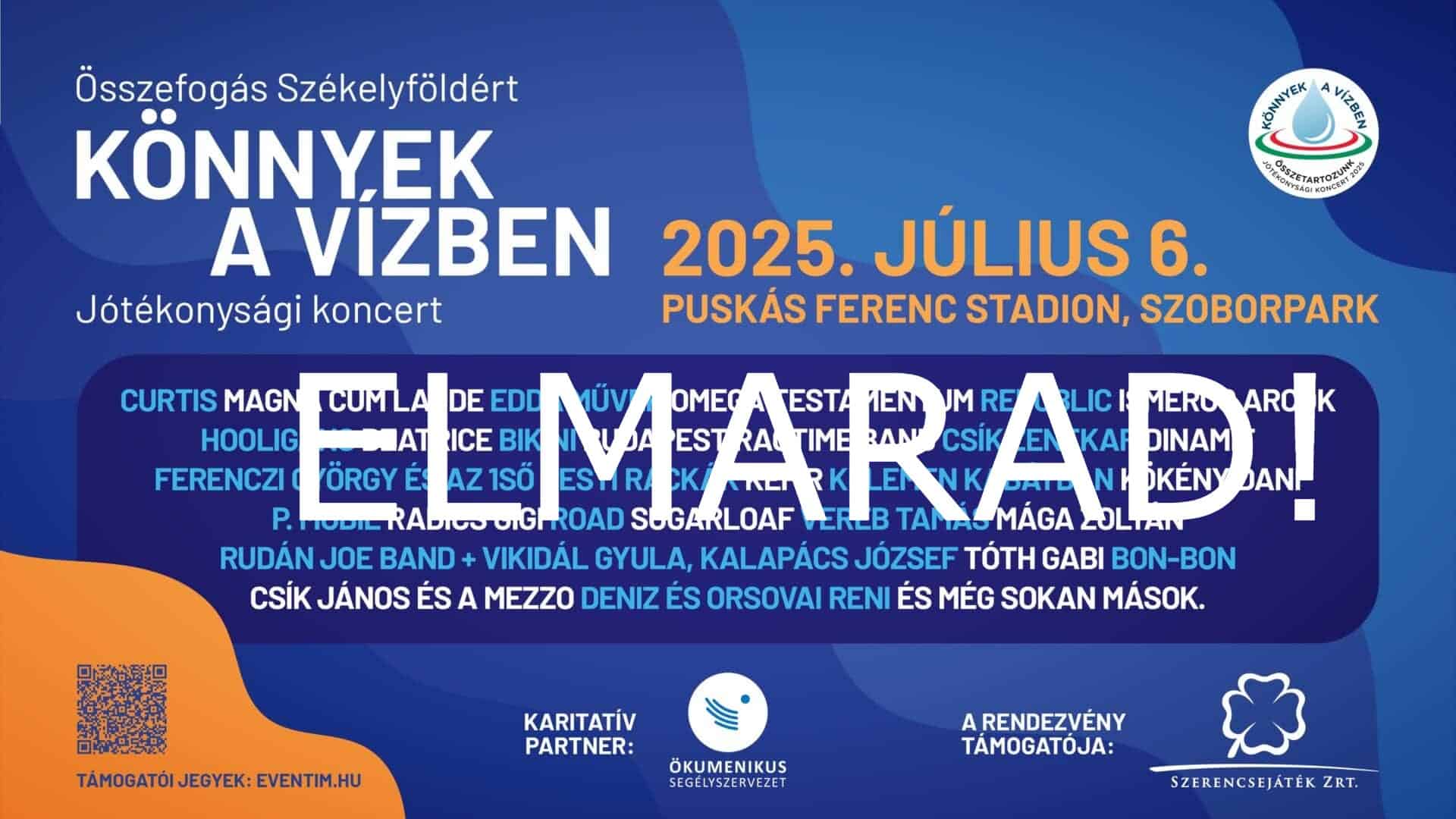 A „Könnyek a vízben” Segélykoncert – a szervezők tervei szerint - várhatóan szeptemberben lesz. Az eddig megvásárolt támogató jegyekről az érintettek dönthetnek, hogy a későbbi időpontban használják fel, vagy kérik a jegy árának visszatérítését. Ennek részleteiről a jegyértékesítő Eventim küld tájékoztatást.