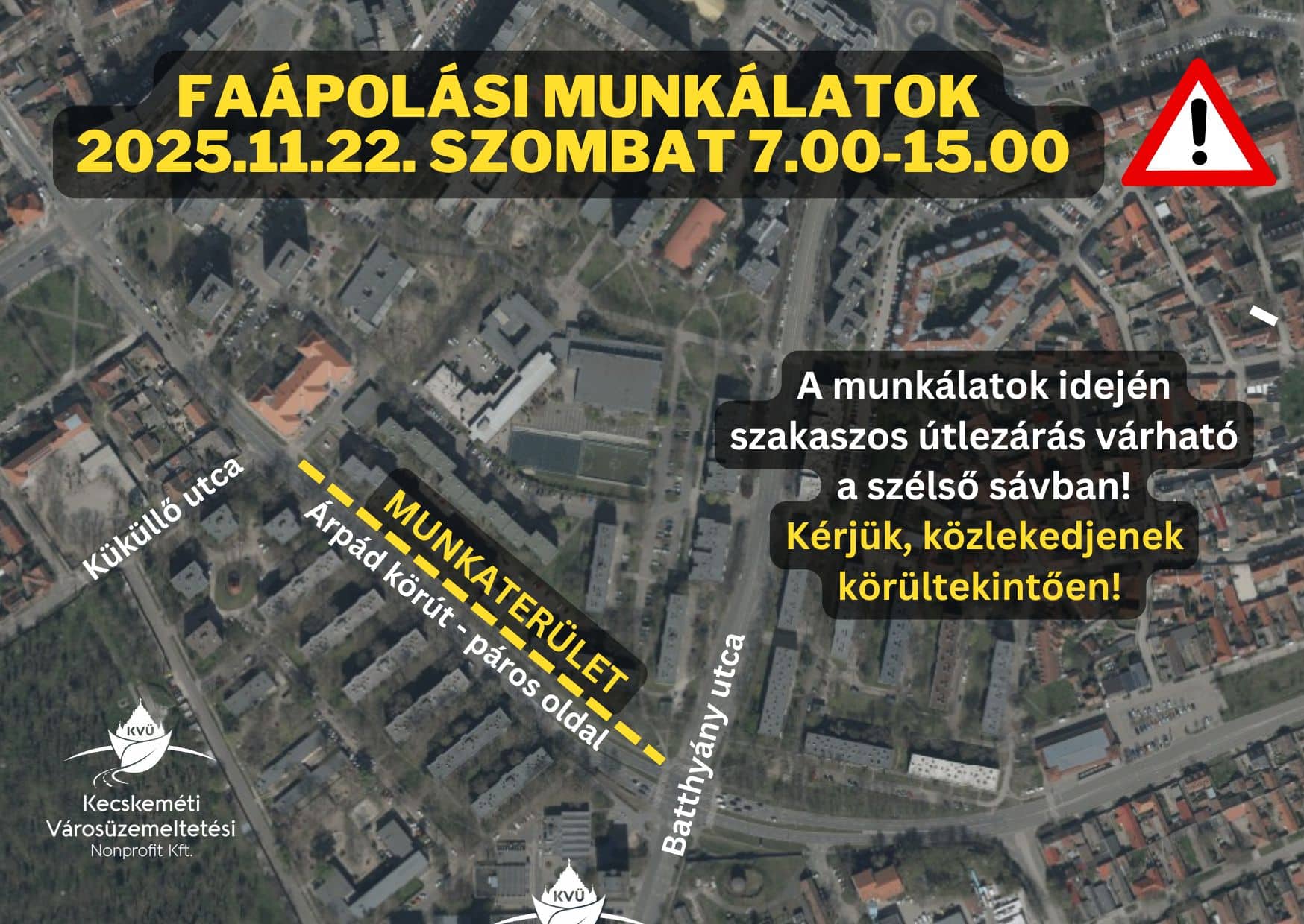 November 22-én szombaton 7.00 és 15.00 óra között faápolási munkát végeznek az Árpád körúton – tájékoztatta szerkesztőségünket a Városüzemeltetési Kft.