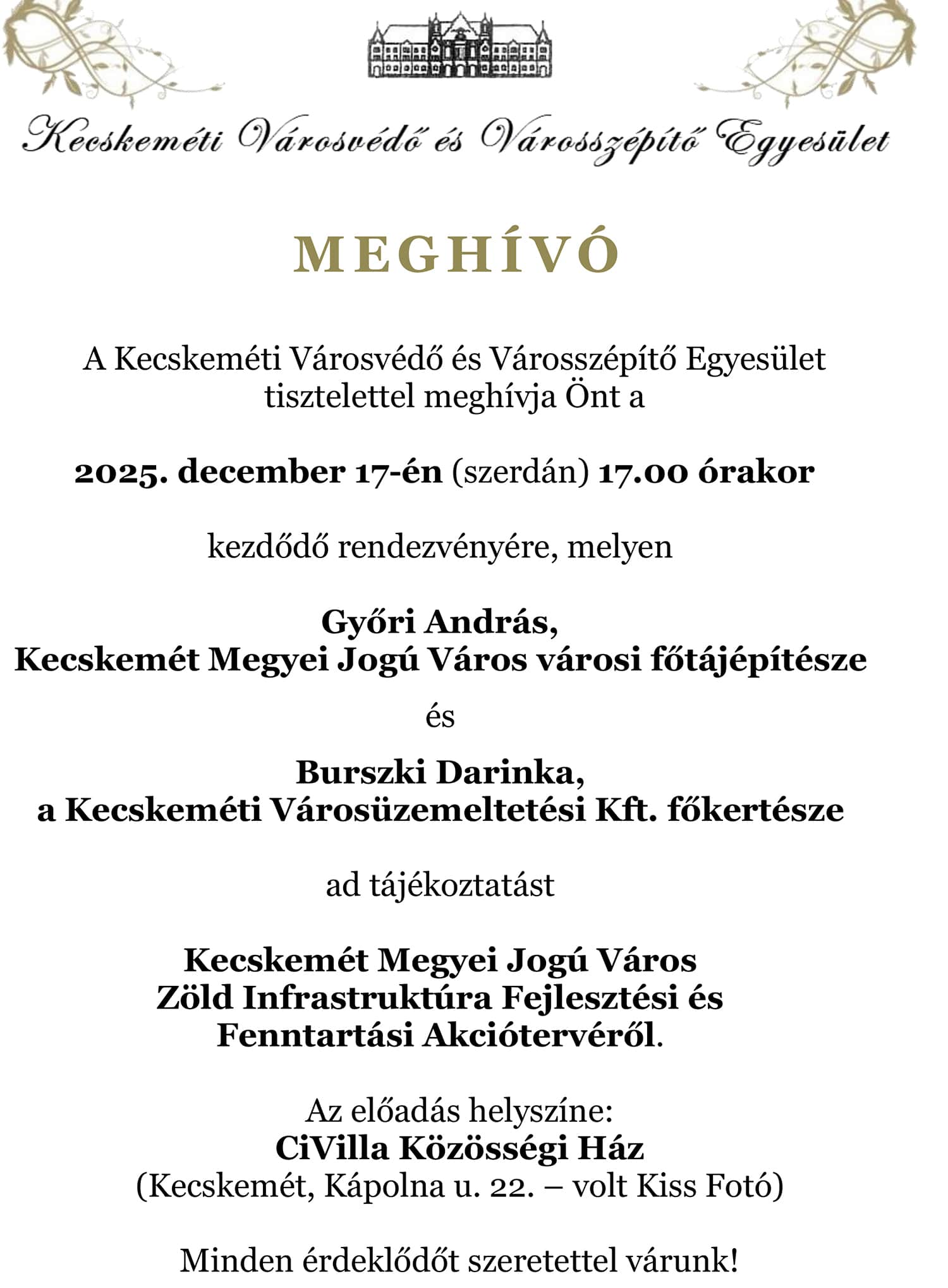 A Kecskeméti Városvédő és Városszépítő Egyesület szervezésében tart tájékoztatást Kecskemét Zöld Infrastruktúra Fejlesztési és Fenntartási Akciótervéről a városi főtájépítész, Győri András, valamint a Kecskeméti Városüzemeltetési Kft. főkertésze Burszki Darinka, december 17-én 17 órától a CiVilla Közösségi Házban (Kecskemét, Kápolna utca 22.).