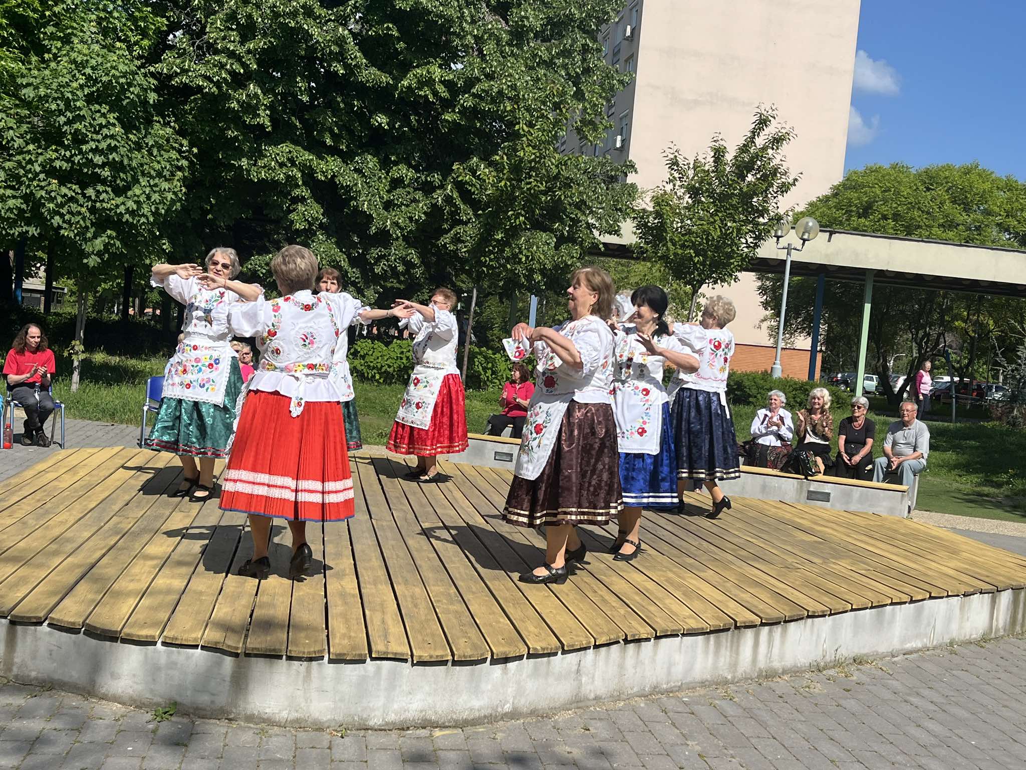 Szenior örömtánccal vette kezdetét az ünnep rövid oktatást követően, melyet Gyöngyösi Ildikó tartott a több tucat szenior érdeklődő számára. Körtáncuk után a Szalkainé Patyi Piroska vezette Hírös Barackvirág Tánccsoport lépett fel, akik látványos bemutatójuk mellett hagyományos kalocsai hímzett fellépőruhájukkal is felhívták magukra a figyelmet.