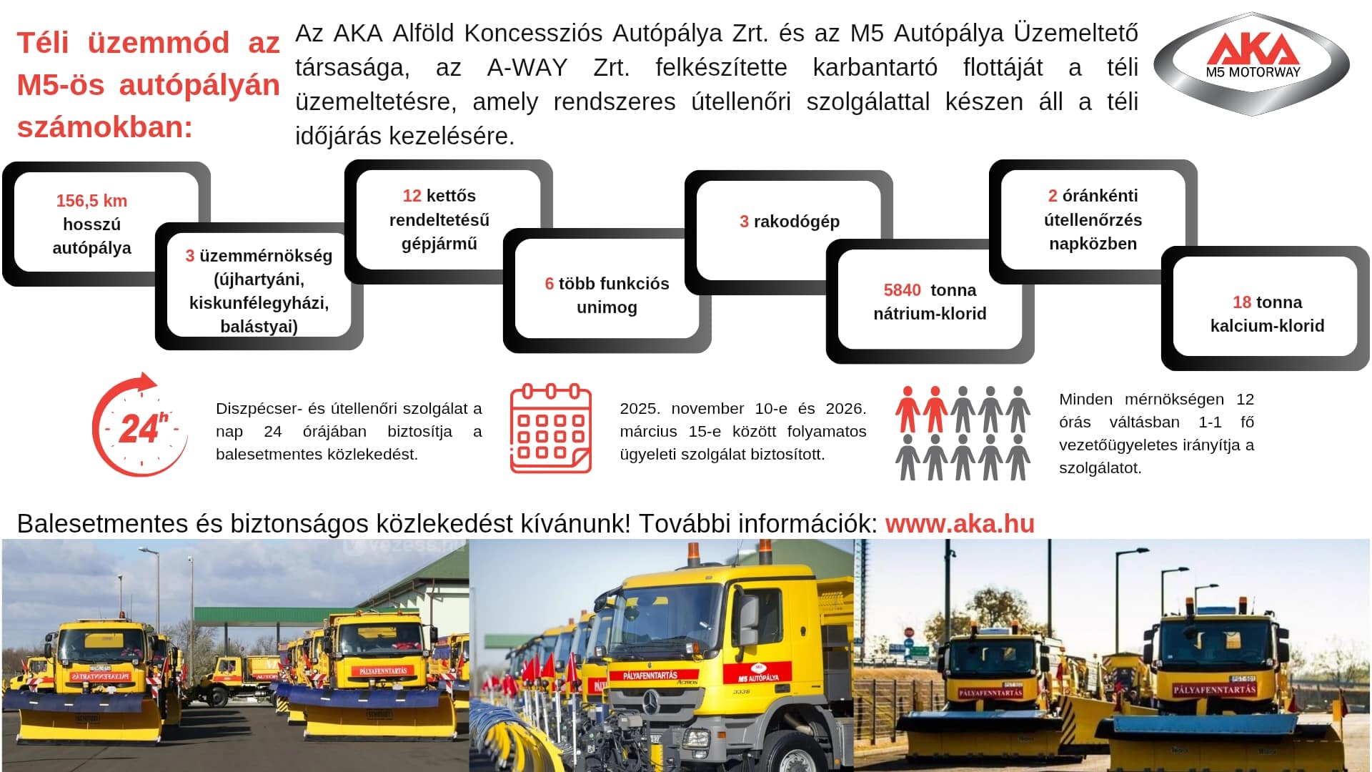 Az AKA Zrt. és az A-WAY Zrt. jogszabályi kötelezettségeinek megfelelően maradéktalanul elvégzi a téli üzemeltetéssel kapcsolatos teendőket. A karbantartó flotta és az autópálya egyaránt készen áll arra, hogy a téli időszakban is zökkenőmentesen működjön. Az üzemeltetési szabályzatnak megfelelően a dolgozók oktatása befejeződött, a folyamatos ügyeleti szolgálat pedig november 10-től március 15-ig biztosított, a szükséges esetekben az időjárási viszonyokhoz igazítva.
