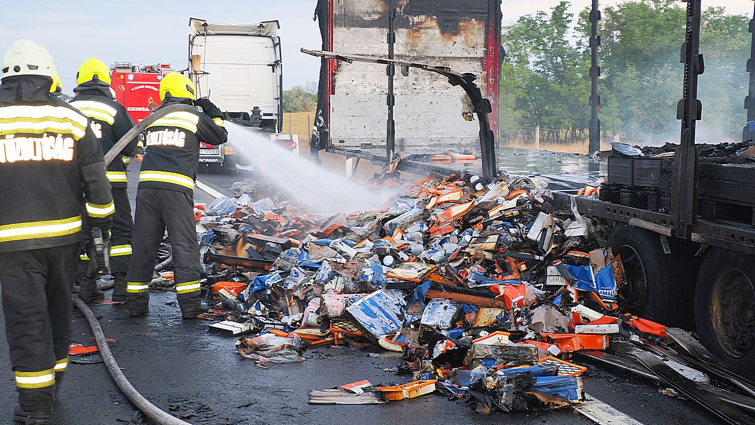 A bolgár kamion Budapest irányába haladt, amikor a bal oldali kereke defekt miatt kigyulladt. A benne egyedül ülő sofőr porral oltóval akarta eloltani, de a lángok gyorsan átcsaptak a mintegy 12 tonna rakományra. A pótkocsis kamion szállítmánya teljes terjedelmében égett, amit csak a túzoltók tudtak eloltani, akik a helyszínre három járművel érkeztek. A munkálatok miatt egy időre teljesen lezárták a főváros felé vezető oldalt, több kilométeres volt a torlódás.A kiégett jármű és a szétégett alkatrészek műszaki mentése majd csak ezután kezdődik, emiatt ismét forgalomkorlátozás várható az M5-ös kiskunfélegyházi szakaszán, a főváros irányába.Úgy tudjuk, hogy a kamion autóalkatrész szállítmányával Németországba tartott volna, amikor pótkocsija kiégett.