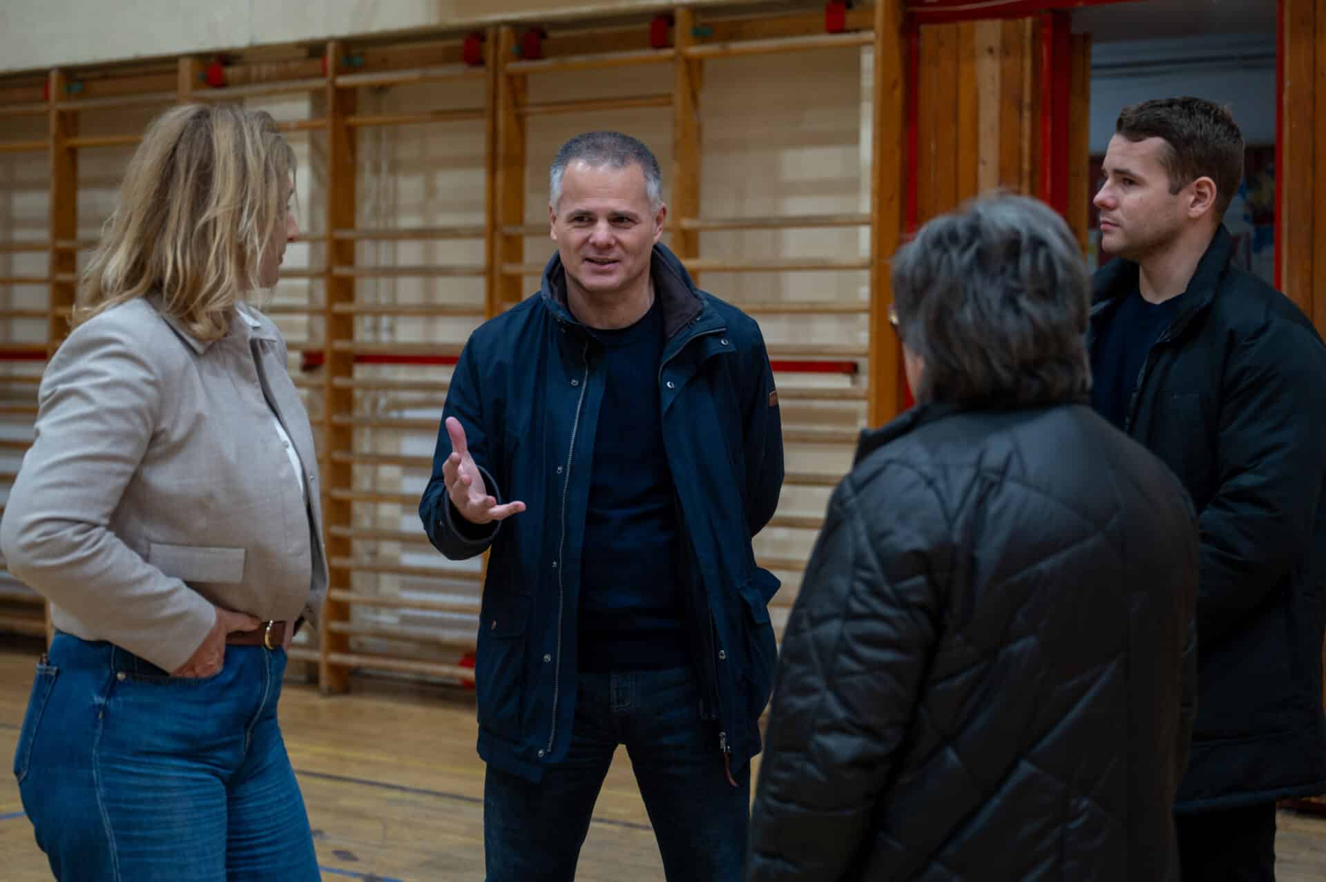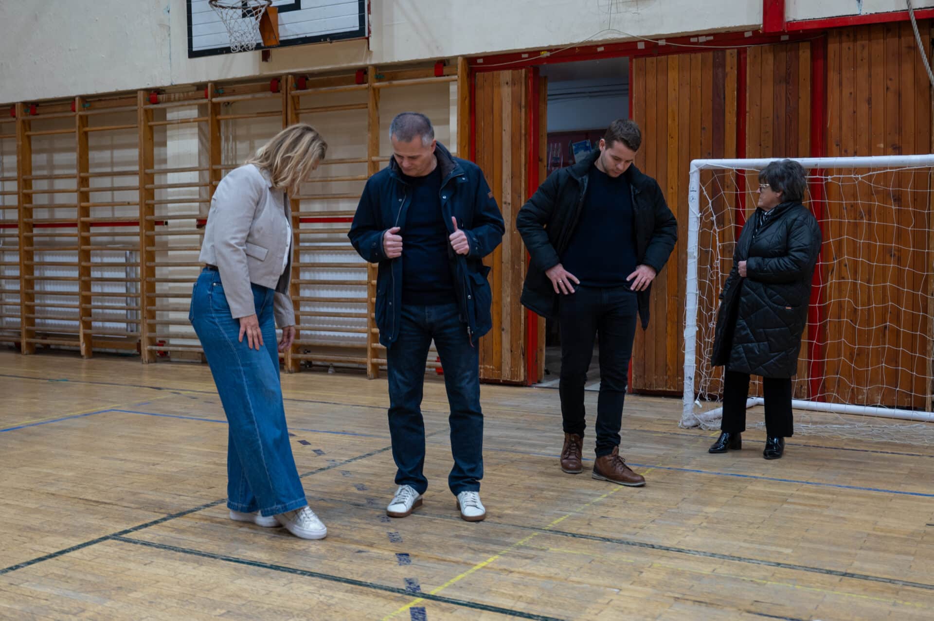 A Lánchíd Utcai Sport Általános Iskola igazgatója mutatja a régi, elhasznált nyílászárókat Engert Jakabné alpolgármesternek, és Dr. Salacz László országgyűlési képviselőnek. Az iskola megélt szebb napokat, az ablakokat sok helyen már nem lehet kinyitni, a lépcsők kimozgósodtak, és több helyen be is ázik az épület. Ezért jövőre többszáz millió forintból kezdik meg a felújítását.