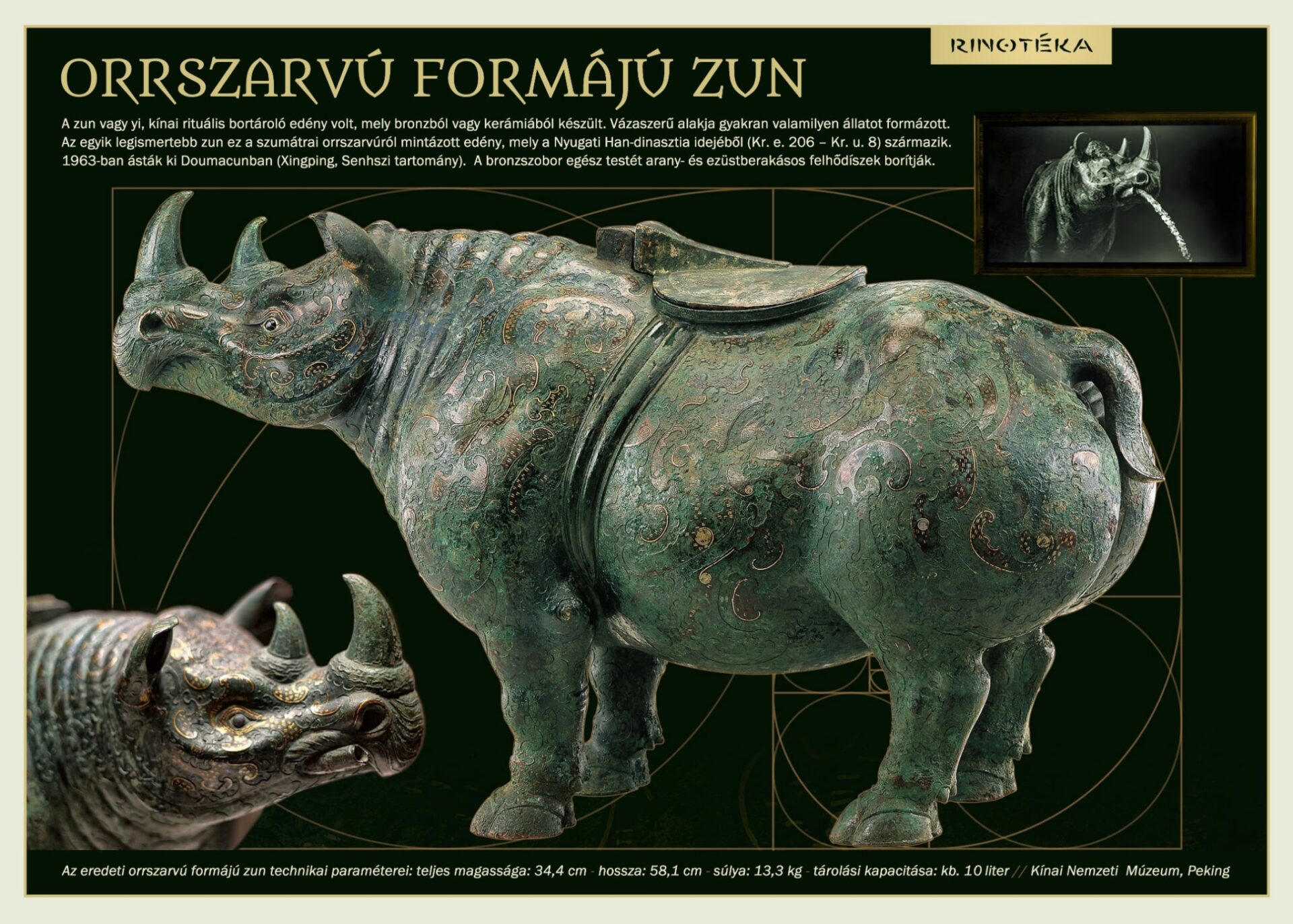 – Ez egy zun, vagyis egy ősi kínai rituális bronz ivóedény. Borral töltötték meg, a száján lévő lyukon keresztül a temetéseken ebből kínálták a vendégeket – meséli lelkesen, majd polcról-polcra végignézzük a kisebb figurákat is.