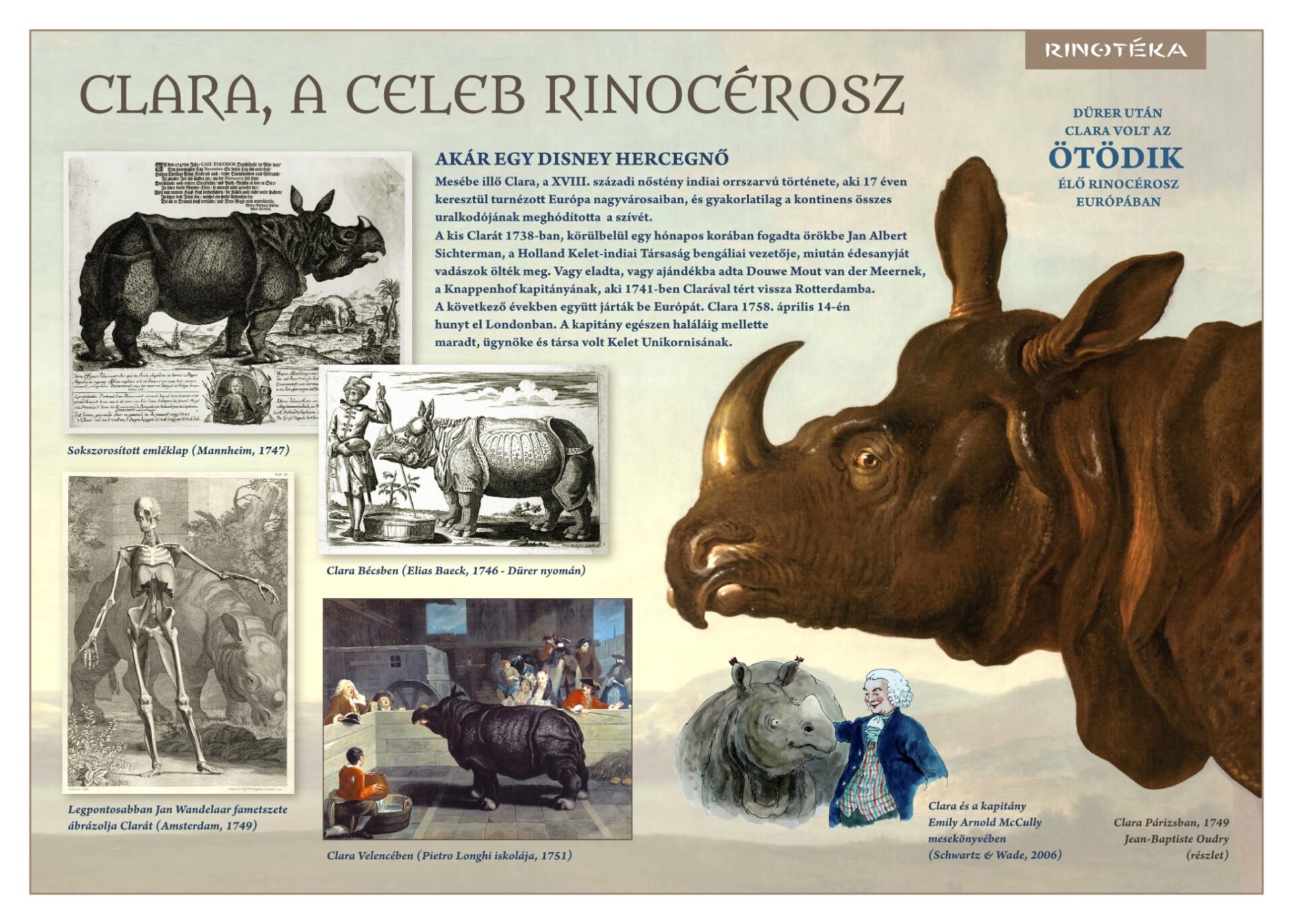 – Dürer rinocérosza után Clara volt a leghíresebb, ő lényegében celebnek számított Európában a XVIII. században. Olyan volt, mint napjainkban egy Disney hercegnő. Árvaként érkezett Indiából, tulajdonosával, egy hajós kapitánnyal 17 éven keresztül turnézott Európa nagyvárosaiban, haláláig luxus körülmények között élt. A beszámolók szerint minden uralkodó szívét meghódította „Kelet Unikornisa” – áradozik róla házigazdánk.