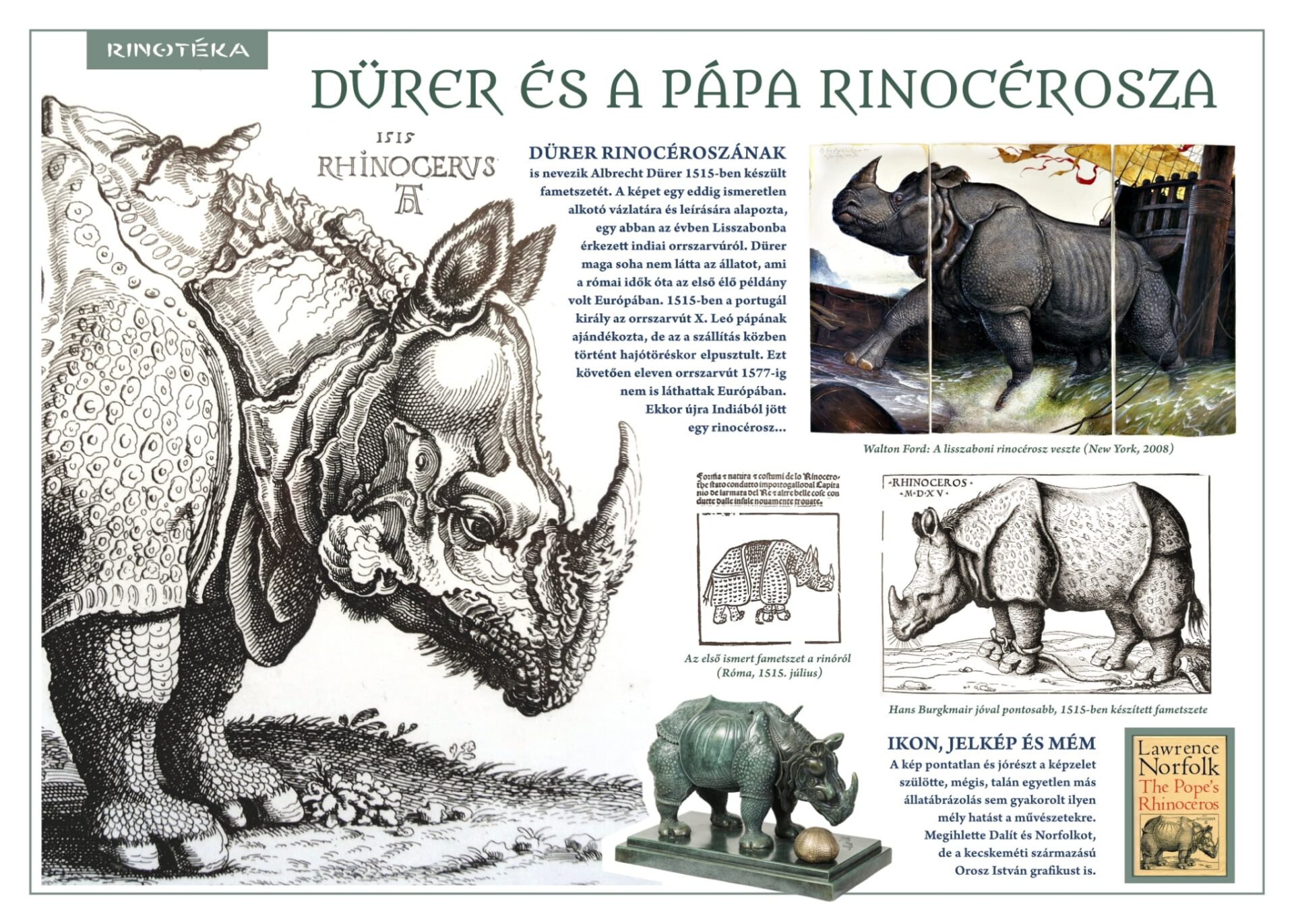 Azt is elmeséli, hogy Dürer sohasem látta modelljét. Ezt a rinocéroszt a portugál király küldte ajándékként X. Leó pápának, de szállítás közben elsüllyedt a hajó, odalett az állat is. Előtte viszont kikötöttek néhány városban, ahol készültek róla skiccek, ezek jutottak el Dürerhez.