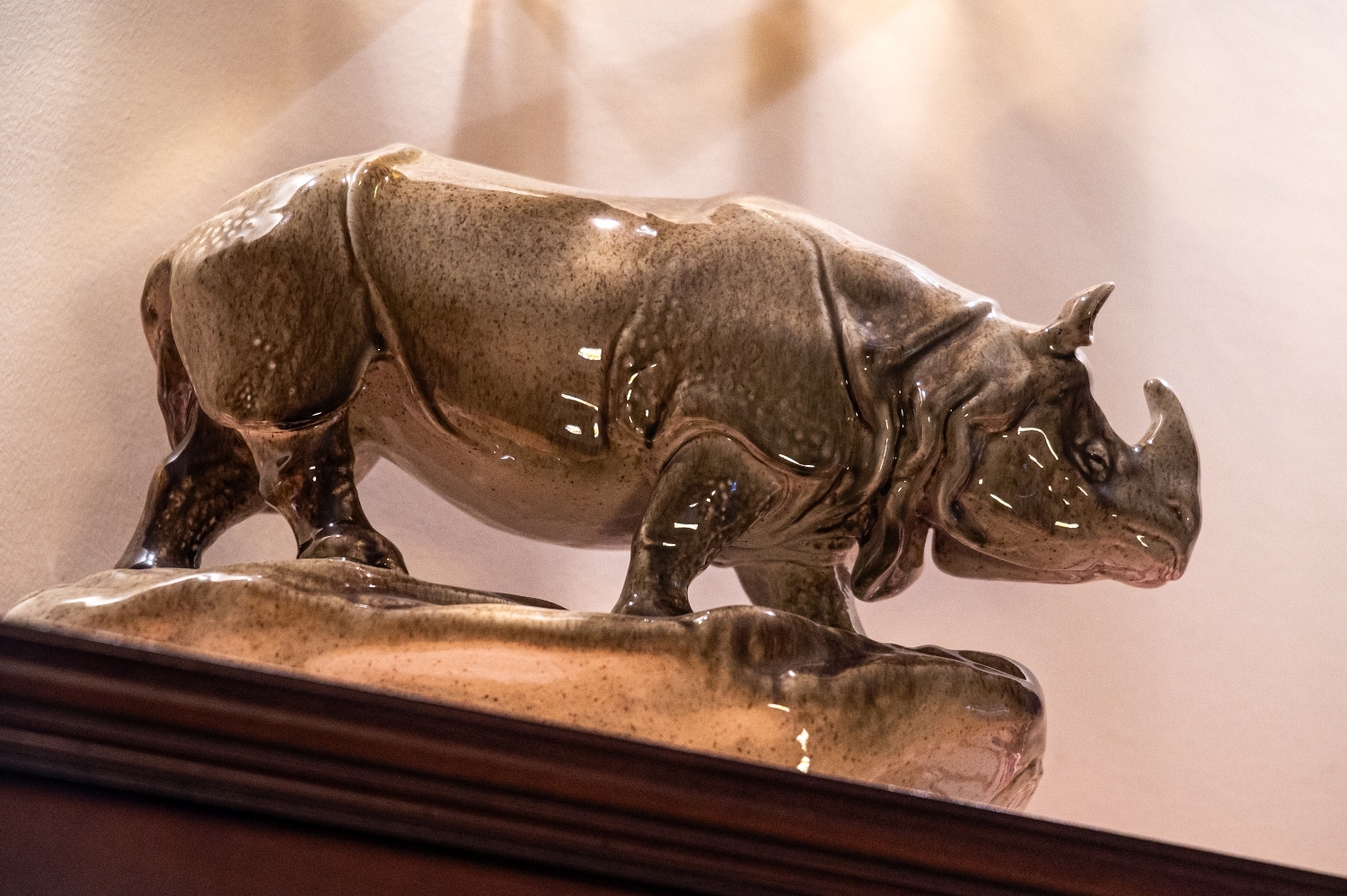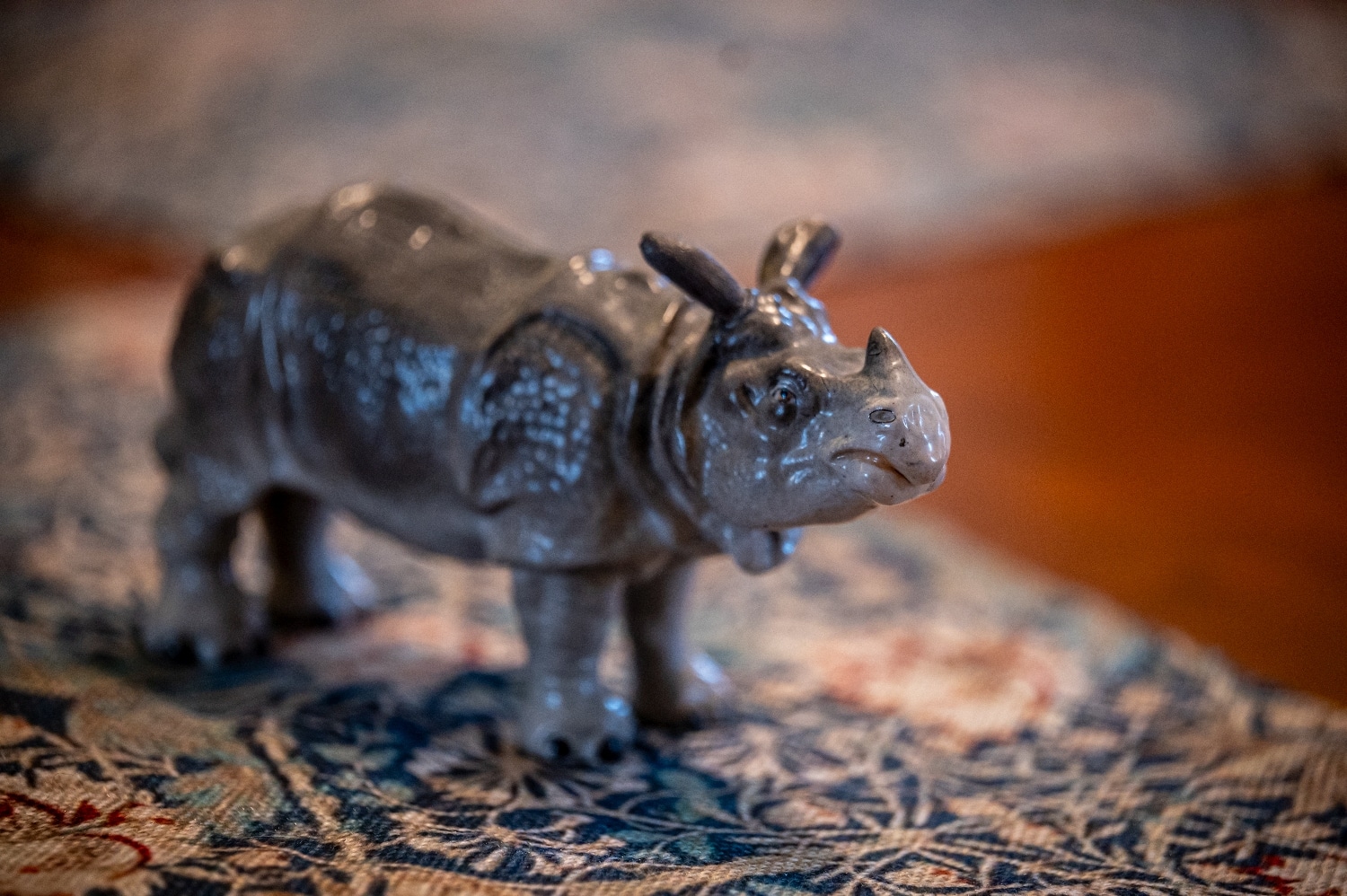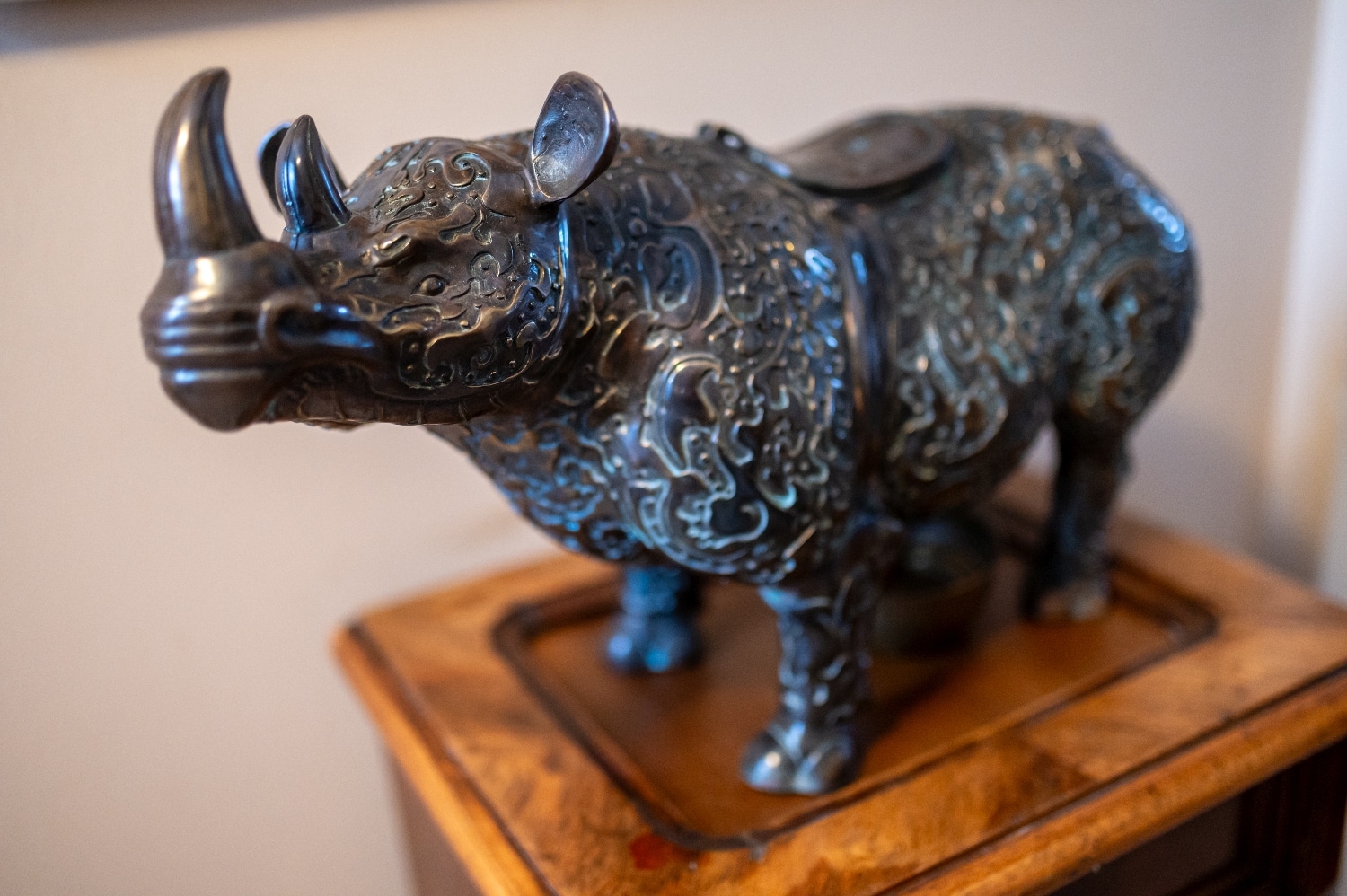 Dolgozószobáját egy tiszteletet parancsoló zöld orrszarvú díszíti, egy hozzá illő asztalkán.