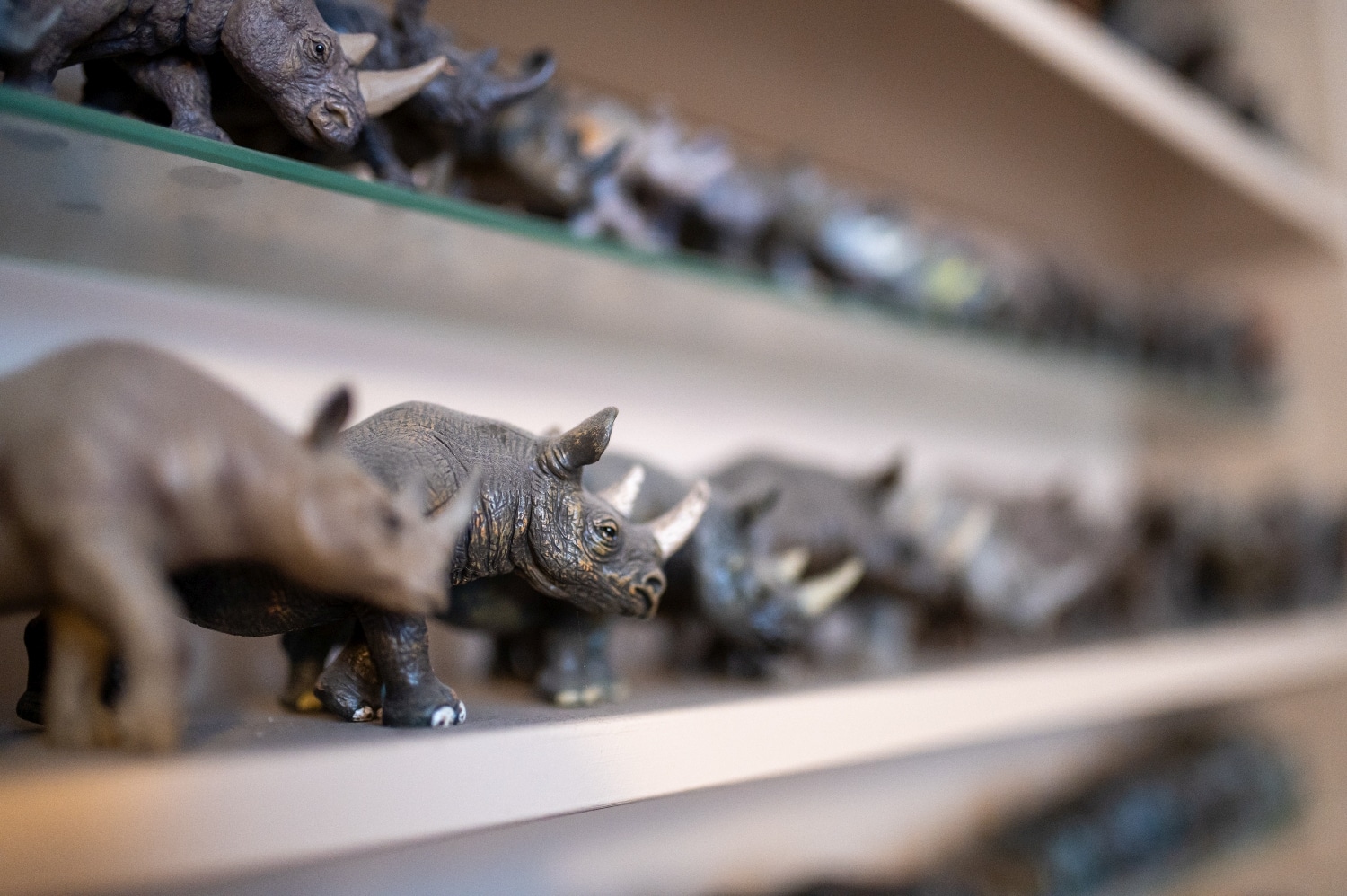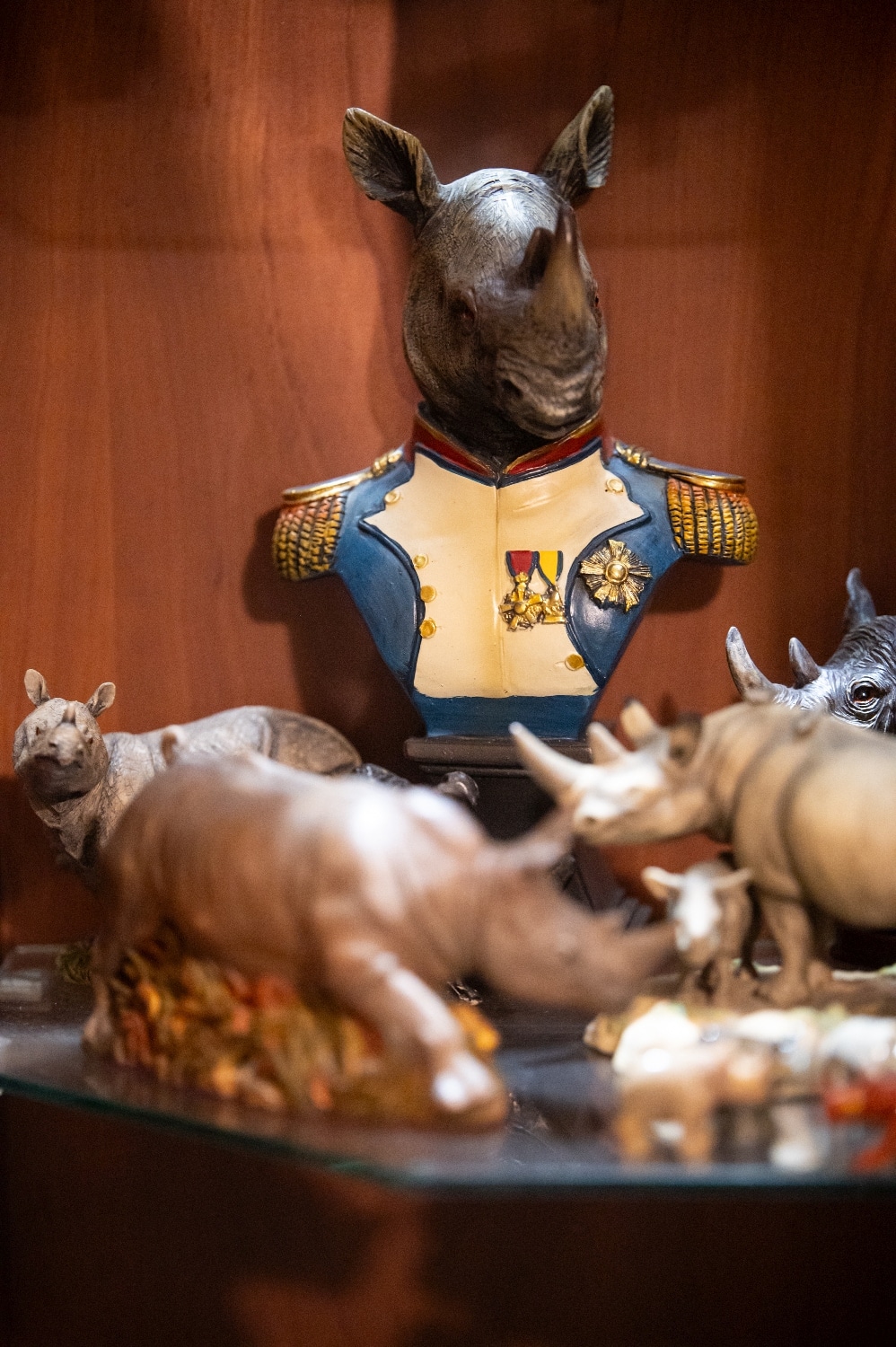 Láthatunk közöttük őskori, dinoszaurusz méretű orrszarvút, ő együtt élhetett az ősemberekkel. Az 1900-as években gyerekeknek készült figurák is sorakoznak a polcokon, ők a Noé bárkája játék részei voltak. Vannak köztük ólom, ólomvázra épített kompozit anyaggal burkolt példányok, kőből, csontból faragott figurák, bőrrel beborított papírmasék, a legújabbak pedig 3D nyomtatással készültek. Az afrikai csordából mutat Csaba fából faragott példányokat is, van közöttük rózsafa, ébenfa orrszarvú, a legsúlyosabb személyiség pedig vasfából készült.