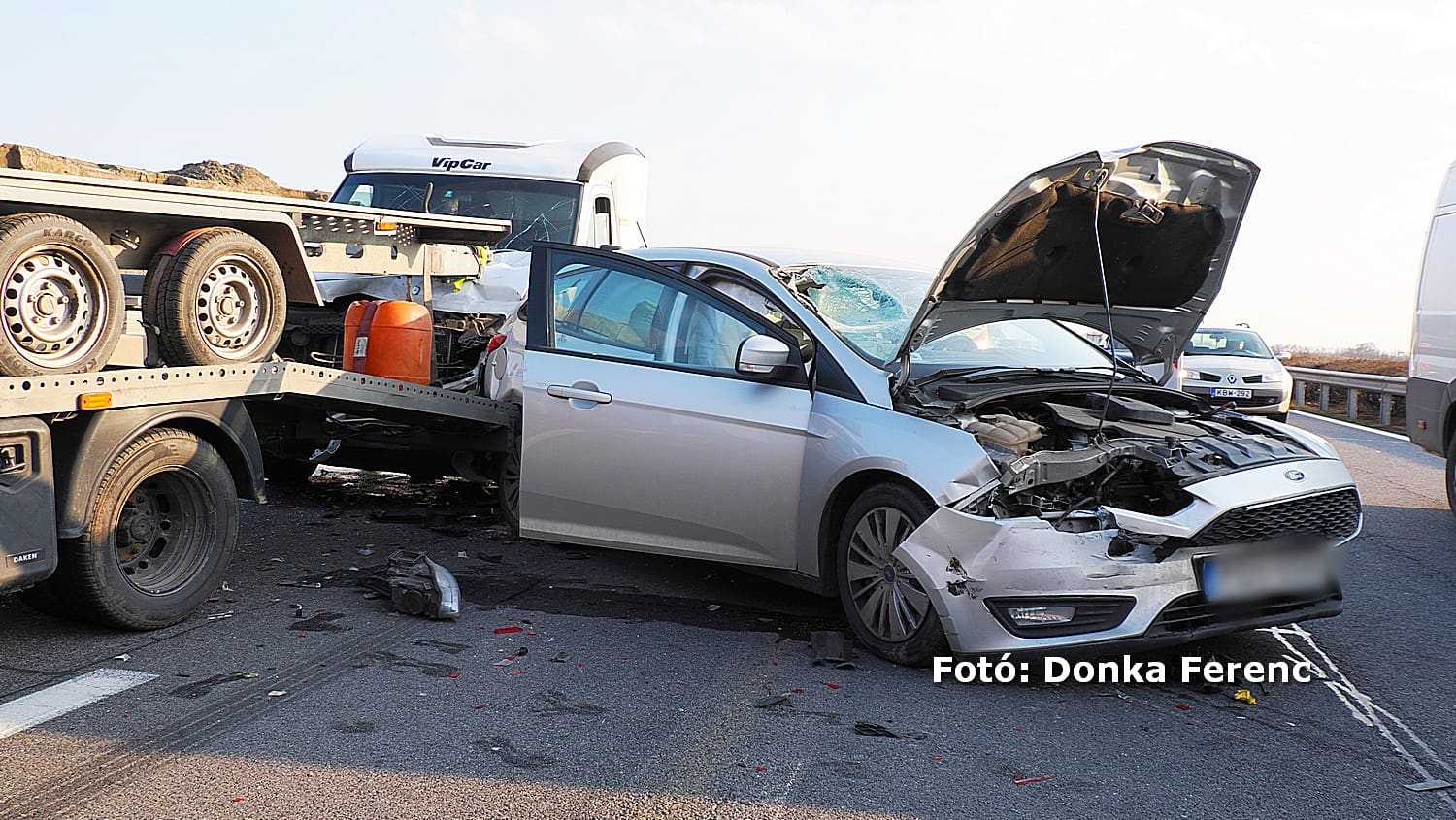 Egy külföldi kamion Budapest irányába haladt, amikor a felüljáró építkezés miatt forgalomkorlátozás volt érvényben, és csak egy sávon haladhatott a forgalom. A kamionos emiatt megállt, a mögötte érkező tréleres autó is megállt, de az utána lévő szintén tréleres autó vezetője ezt későn vette észre és nagy sebességgel az előtte állókba hajtott.