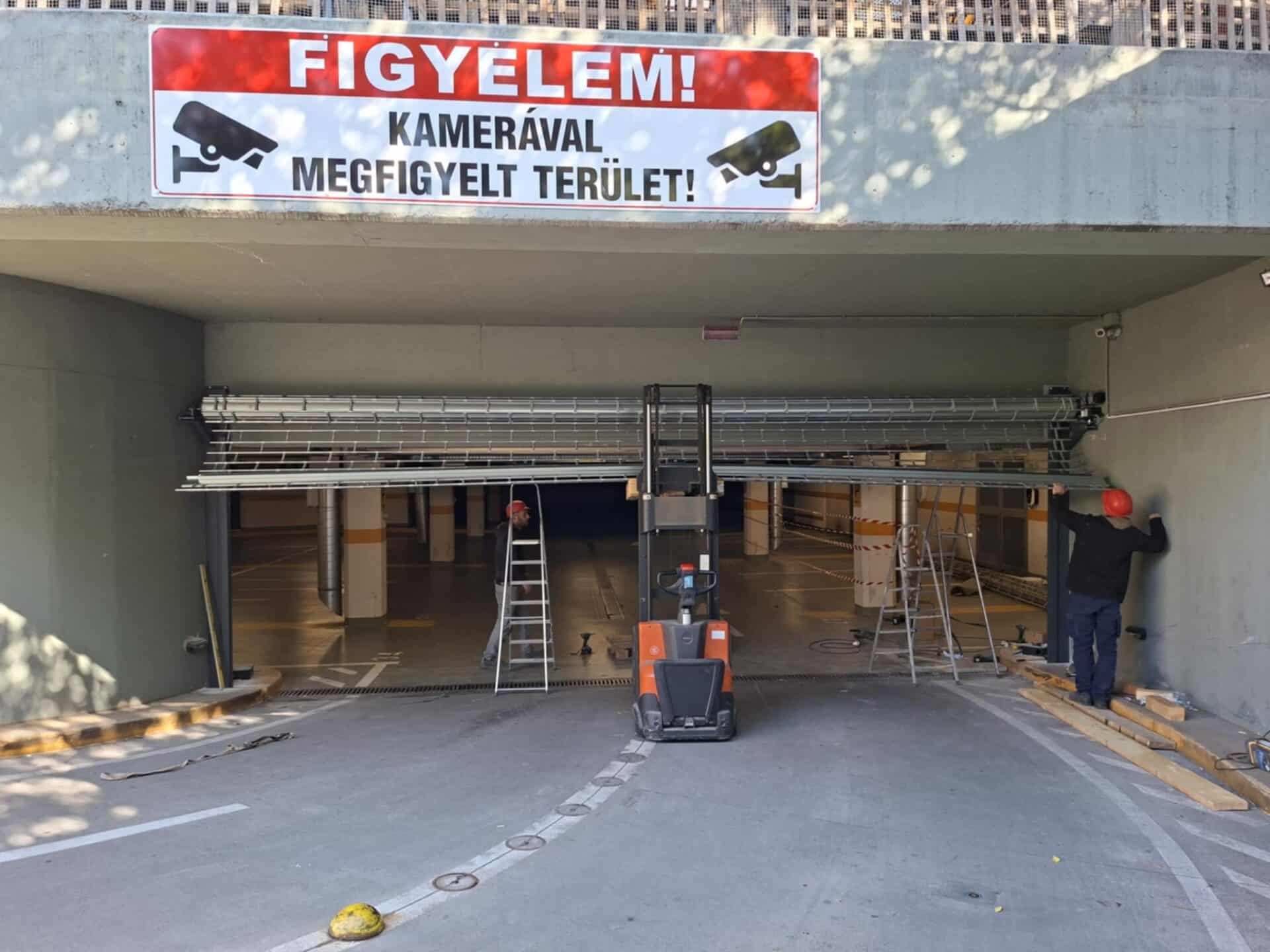Szükségessé vált a Budai utcai mélyparkoló lehajtó sávjában elhelyezkedő 8 méteres felgördülő rácsos kapujának komplett cseréje, mivel egy sérülés következtében az rongálódott, használhatatlanná vált. Így a kissé már elavult rács roló (tartó konzol) cseréjével, a helyreállító és beüzemeltető munkálatok során a mélygarázs, egy új, modernebb, könnyebben kezelhető, biztonságos szerkezetet kapott.