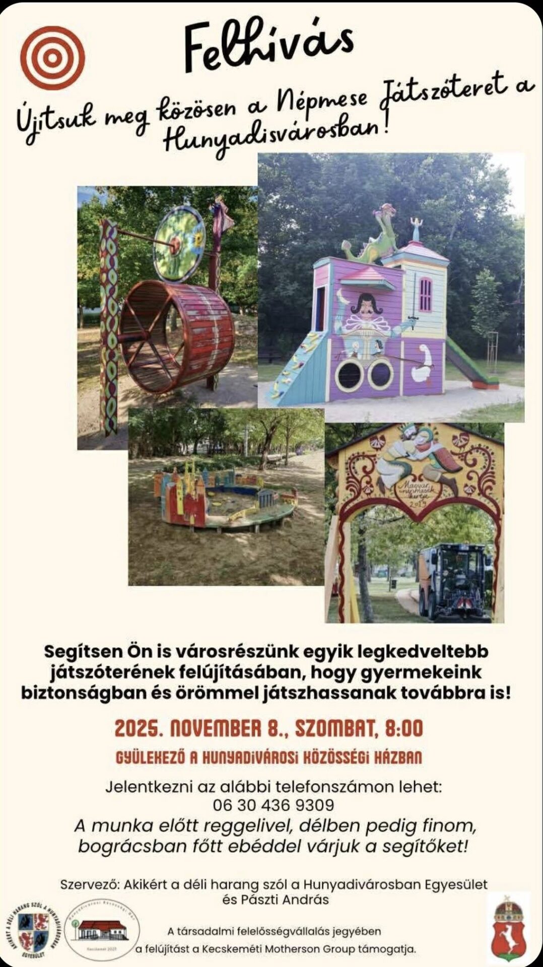 Az Akikért a déli harang szól a Hunyadivárosban Egyesület és Pászti András képviselő közösségi munkát szervez a Népmese Játszótér felújítására november 8-án szombaton reggel 8 órától. A nap folyamán reggelivel és ebéddel is várják mindazokat, akik szívesen közreműködnének abban, hogy a gyerekek továbbra is biztonságosan játszhassanak. Jelentkezni a 06 30 436 9303-as telefonszámon lehet.