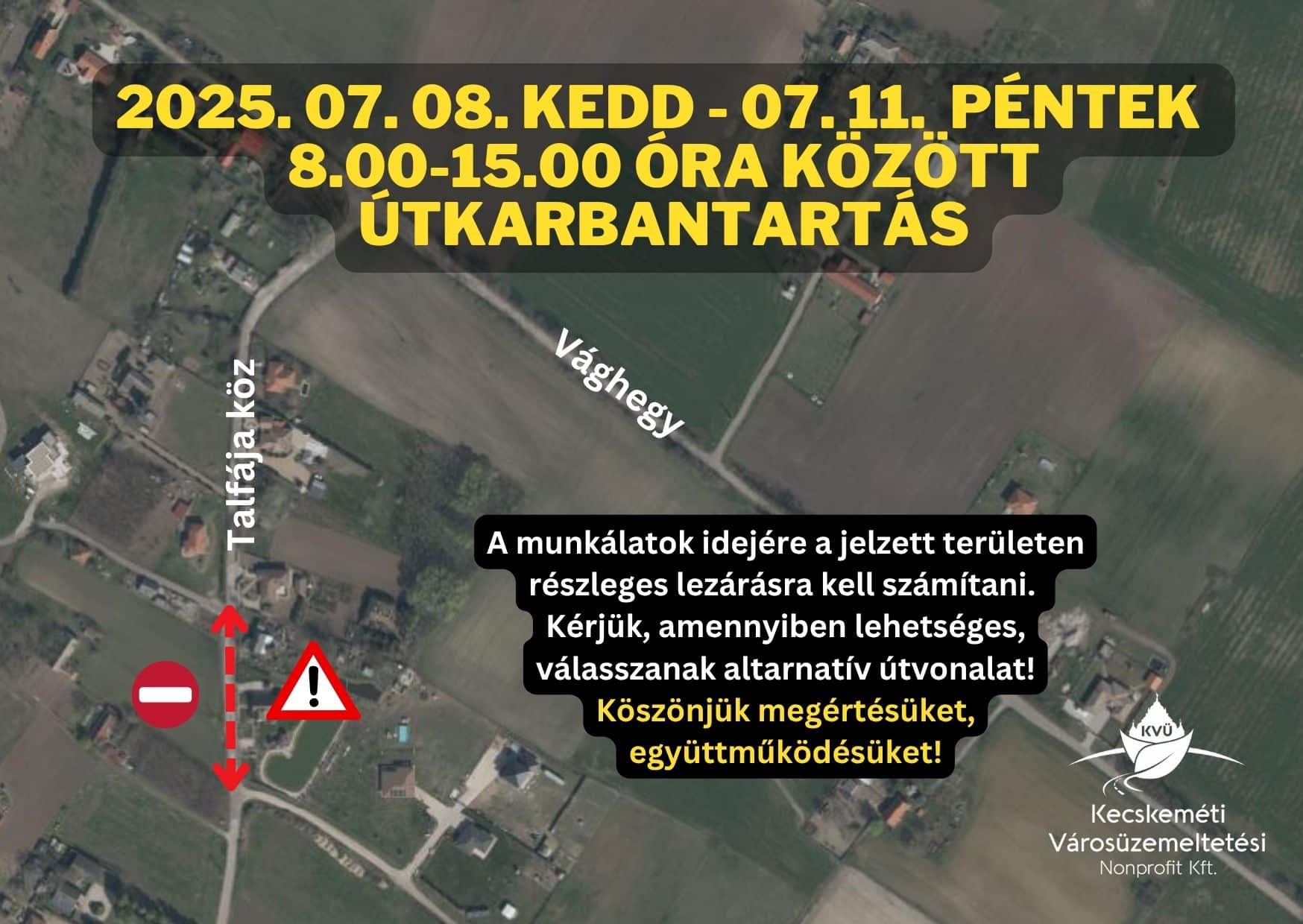 2025. július 8. keddtől július 11. péntekig 8.00 és 15.00 óra között a Talfája köz Vághegy felőli szakaszán, a két utolsó nagyobb leágazás közti útszakaszon részleges lezárásra kell számítani útkarbantartási munkálatok miatt. Kérjük, aki teheti, válasszon alternatív útvonalat. Köszönjük együttműködésüket, megértésüket! - írta közleményében a Kecskeméti Városüzemeltetési Kft.