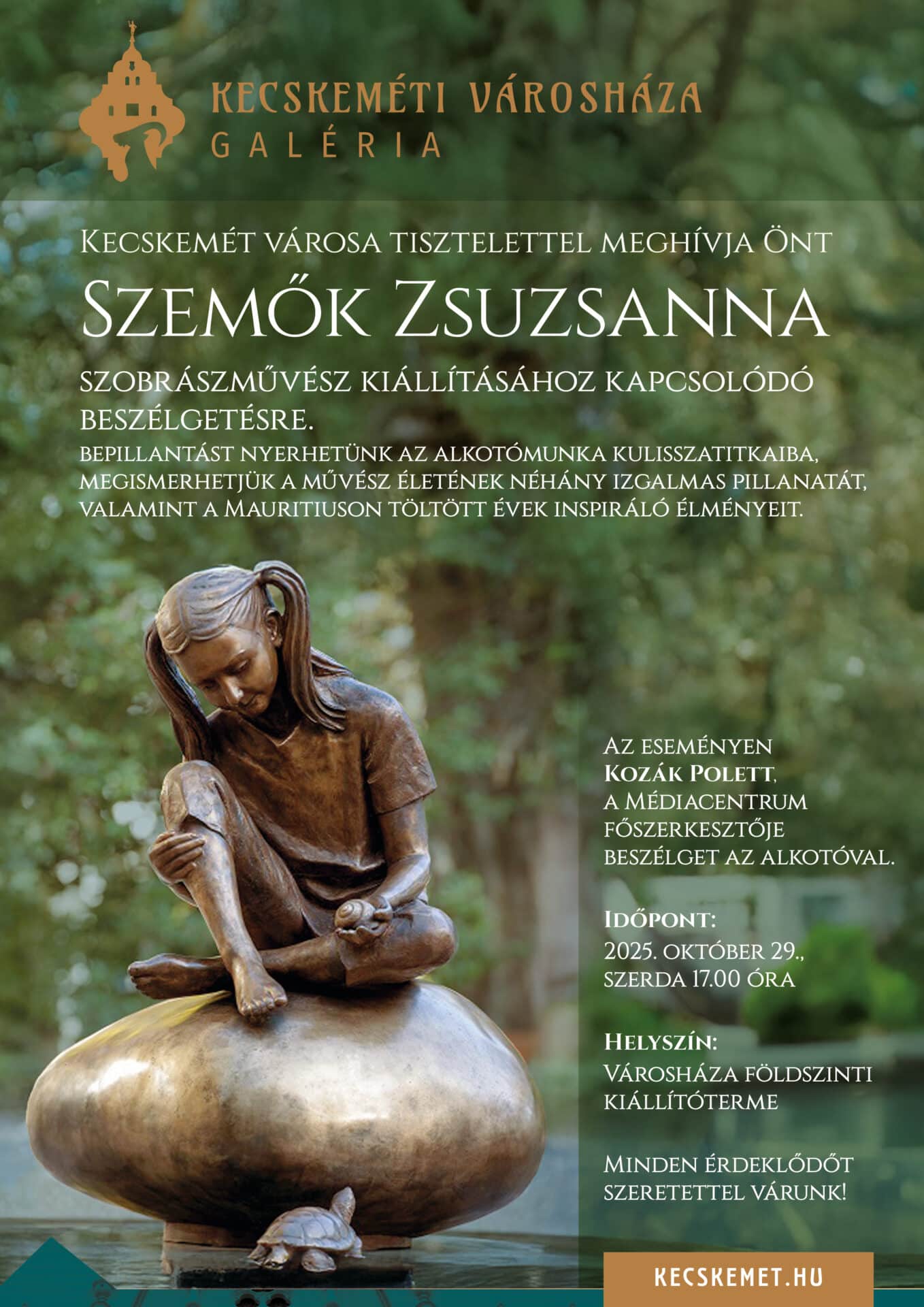 A kiállításhoz kapcsolódóan a szobrászművésszel Kozák Polett, a Kecskeméti Médiacentrum ügyvezető-főszerkesztője beszélget művészetének kulisszatitkairól, a mauritiusi élményeiről, valamint életének izgalmas pillanatairól.