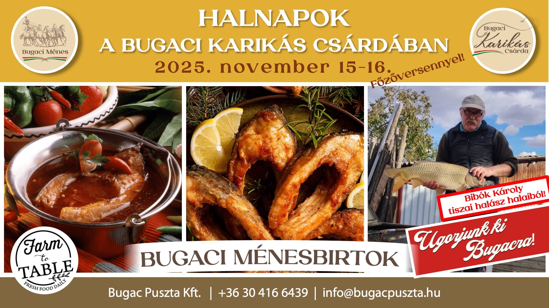 November 15-16-án a kiszáradt homokhátságon, a Bugaci Karikás Csárdában halfőző verseny és halnapok lesznek. A szervezők ezzel a rendezvénnyel a finom halászlé készítésen és elfogyasztásán túl, szeretnék felhívni a figyelmet a Kiskunsági Homokhátság problémáira is.