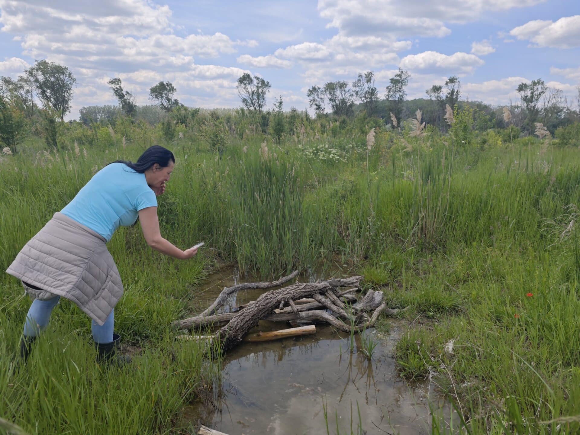 A fehér és a lila zsályák, cickafark és pipitérek között kamilla és pipacs is nyílik, ezek maguktól hajtottak ki, a legtöbb fajta nevét Kata sem ismeri. De minden egyes virágnak örül, hisz velük is gazdagabb az erdőpark ökoszisztémája. Ezrével döngenek itt a méhek, és hatalmas szitakötők röpködnek a fejünk fölött. Nem csoda, hisz saját kis mocsara is van az erdőparknak. Ezt is megmutatja Kata, aki gumicsizmában lépked az ingoványos területen. Én próbálom követni, nehogy elmerüljek.